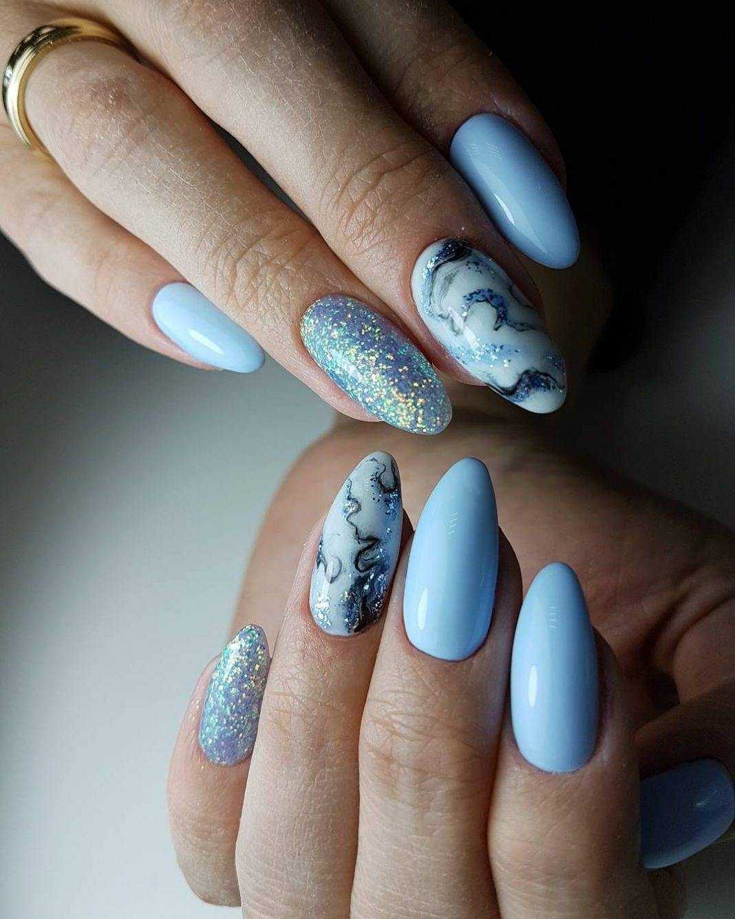 При желании можно комбинировать рисунки в одном маникюре. Декоративные элементы в данном случае используются не слишком часто. В основном это блестки разных оттенков и размера.