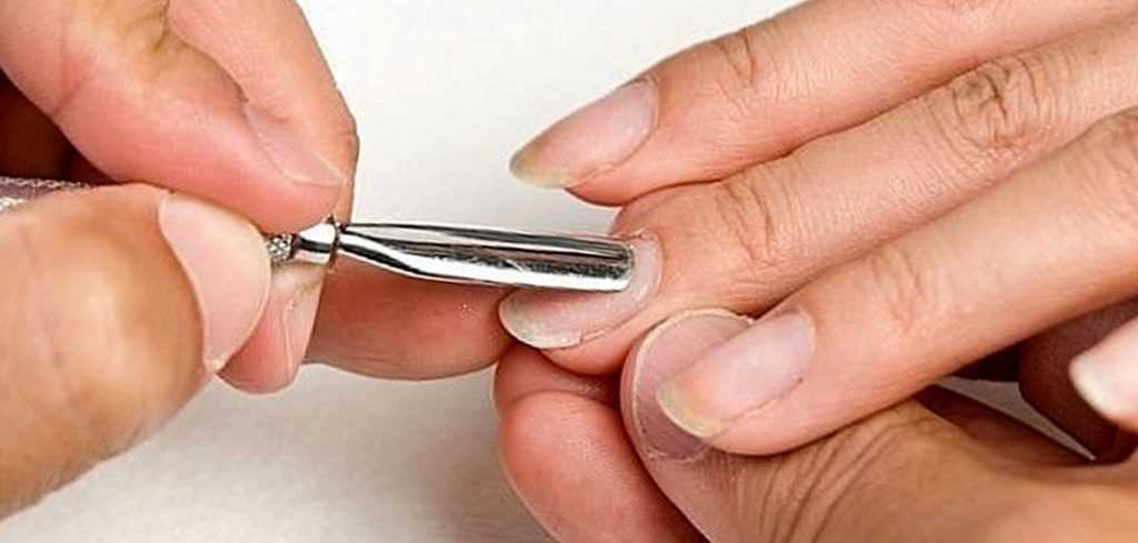 - Подготовить ногти, выполнив традиционный маникюр с максимальным удалением кутикулы – обрезной или аппаратный. При аппаратном уходе приподнять край остающейся на ногте кожи немного вверх.
