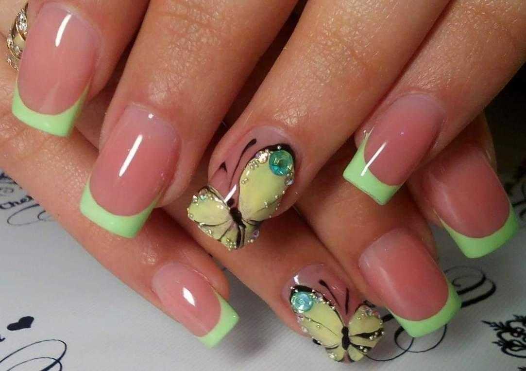 - Френч. Классический французский маникюр уместен как на коротких, так и на длинных ногтях. Элегантность может дополнить озорной яркий мотылек с пестрыми крыльями.