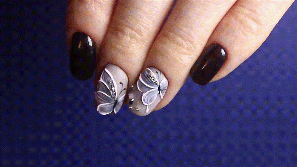 - Бабочки в нейтральных тонах. При этом маникюр может быть черно-белым, что сделает его универсальным. Не потребуется подбирать специально одежду, чтобы образ гармонировал.