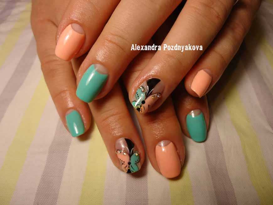 Еще один способ проявить оригинальность – покрыть ноготки узорами, имитирующими расцветку части крылышка бабочки. Такой способ подойдет для создания яркого летнего маникюра.
