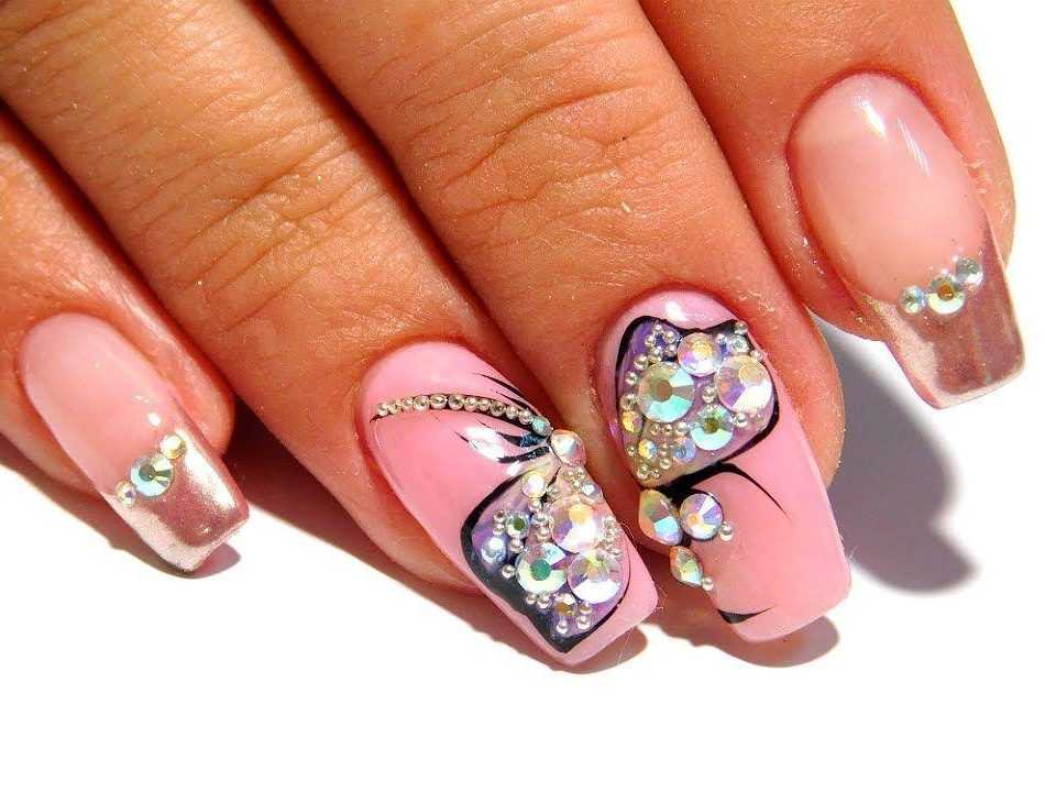 Шикарно смотрится маникюр, в котором бабочки полностью либо частично выложены из страз. Чтобы стразы держались дольше, используйте маленькую хитрость. Когда вы уже завершите маникюр, возьмите тонкую кисть, обмакните ее топ и аккуратно обведите каждую стразу. Затем высушите топ в лампе. Так маникюр дольше сохранит свой первозданный внешний вид.