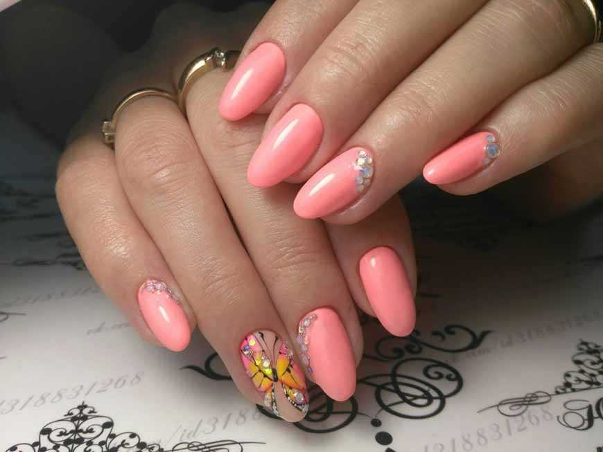 Бабочка на ногтях со стразами – эффектный и выигрышный вариант оформления ноготков. Стразы лучше всего подходят для декора бабочек и стрекоз. Их можно разместить по краям крылышек, вдоль спинки, на кончиках усиков. Форма ноготков может быть любая
