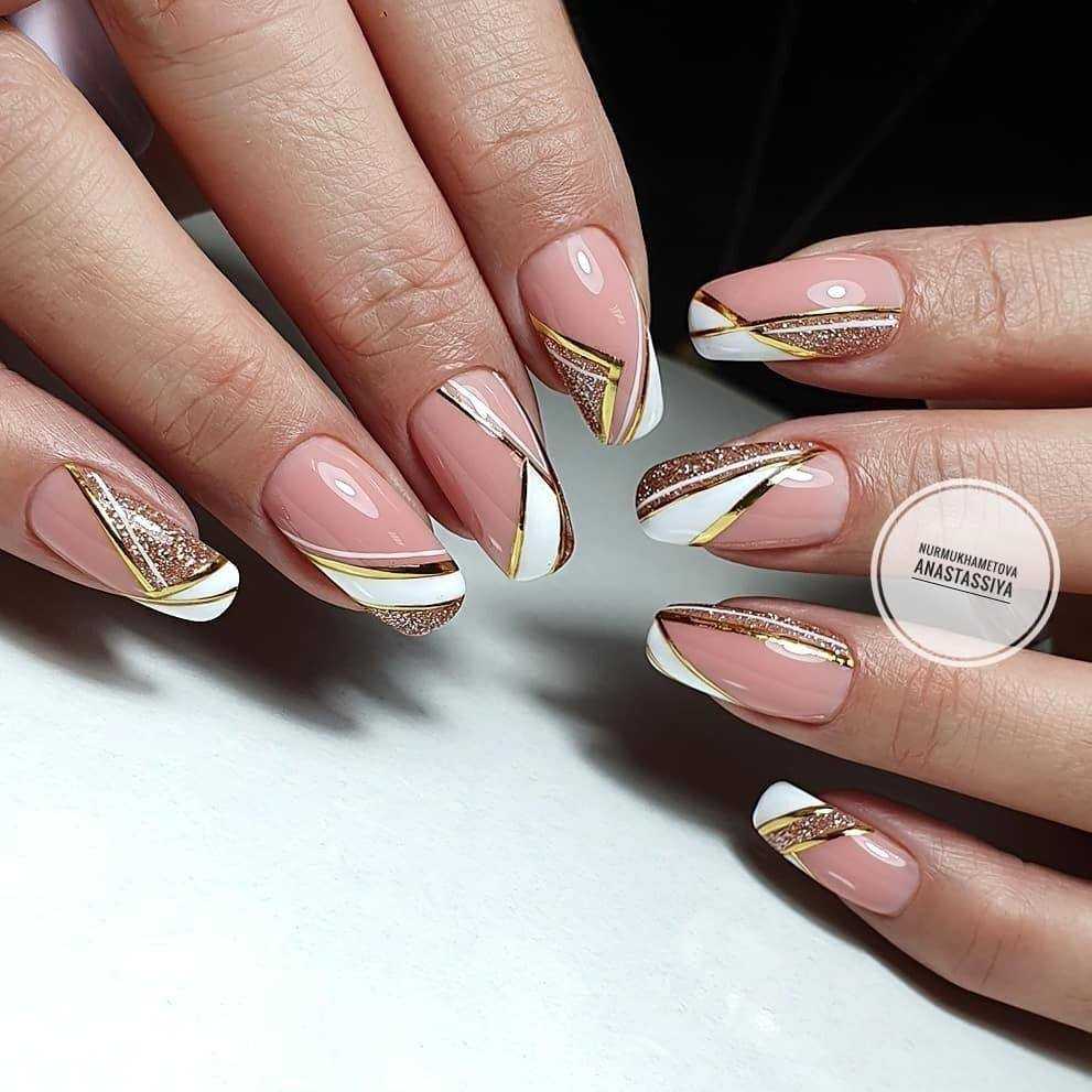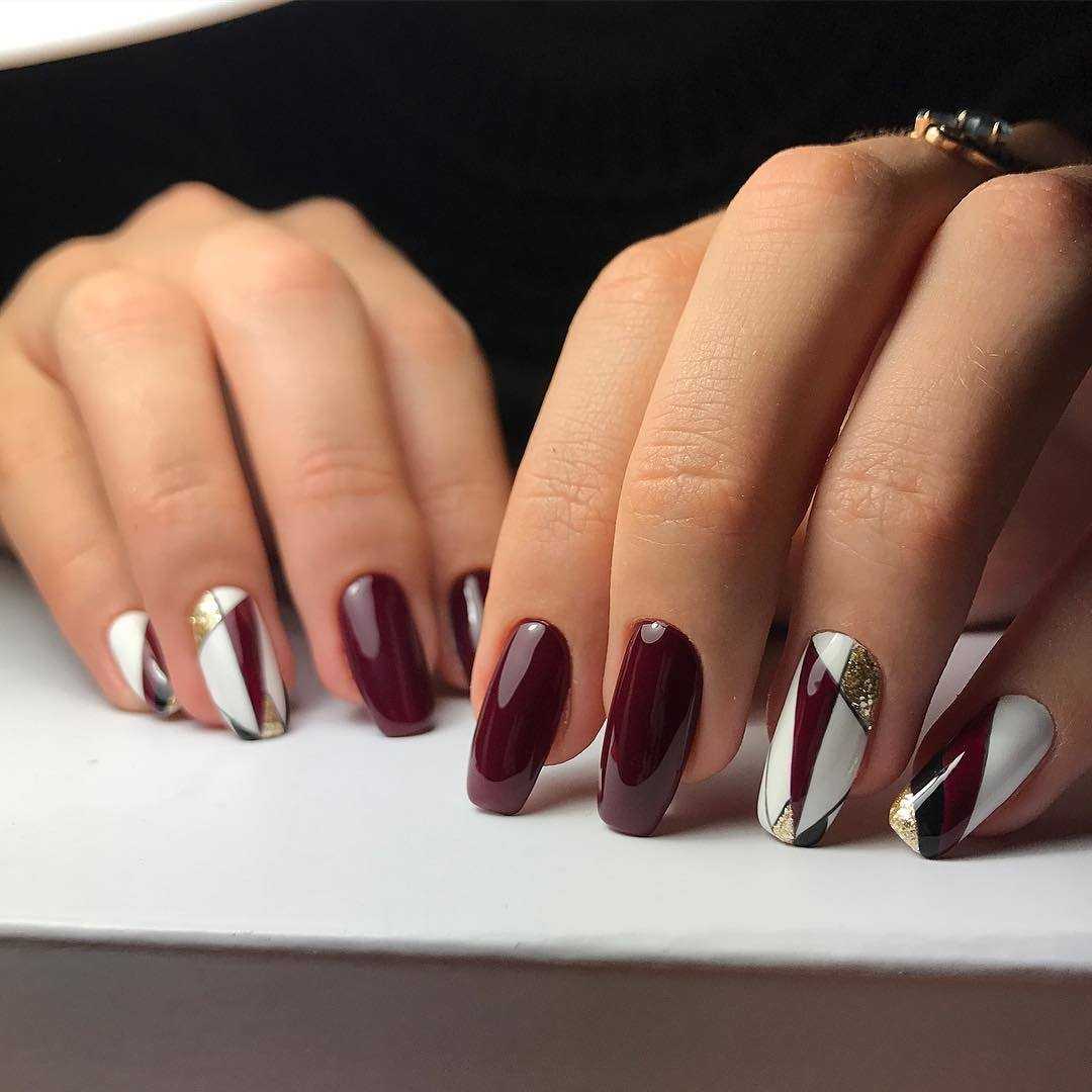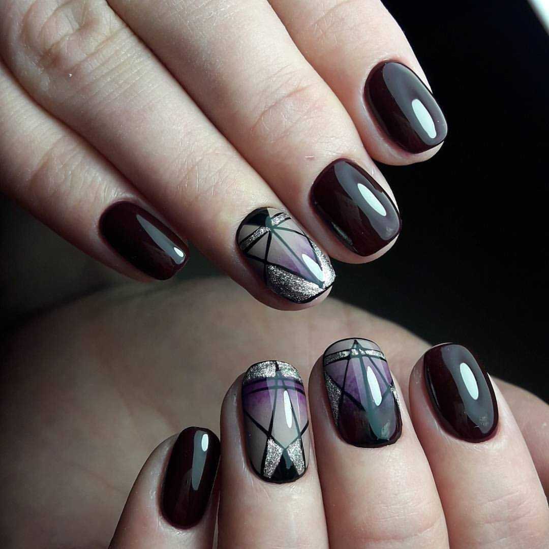 В 2020 году стоит присмотреться к геометрическому дизайну. Тонкие линии, фигуры и точки – все это можно использовать для создания бесчисленного количества рисунков на любой вкус. К тому же, многое зависит от техники нанесения. В домашних условиях использовать кисти не всегда удобно. Выбирайте стемпинг для симметричности. С помощью блесток можно подчеркнуть одну-две линии, что сделает дизайн чуть более ярким.