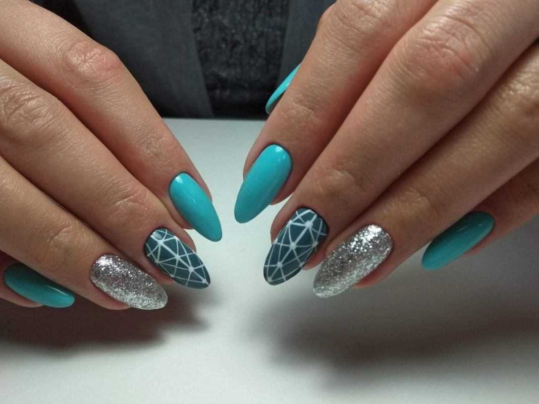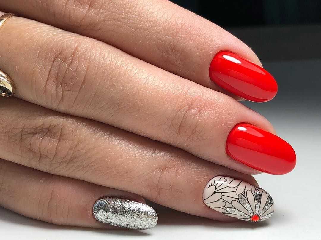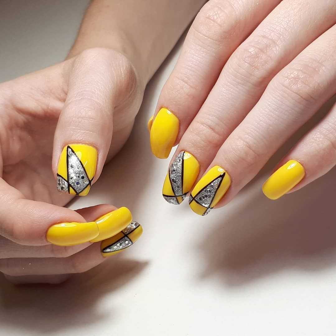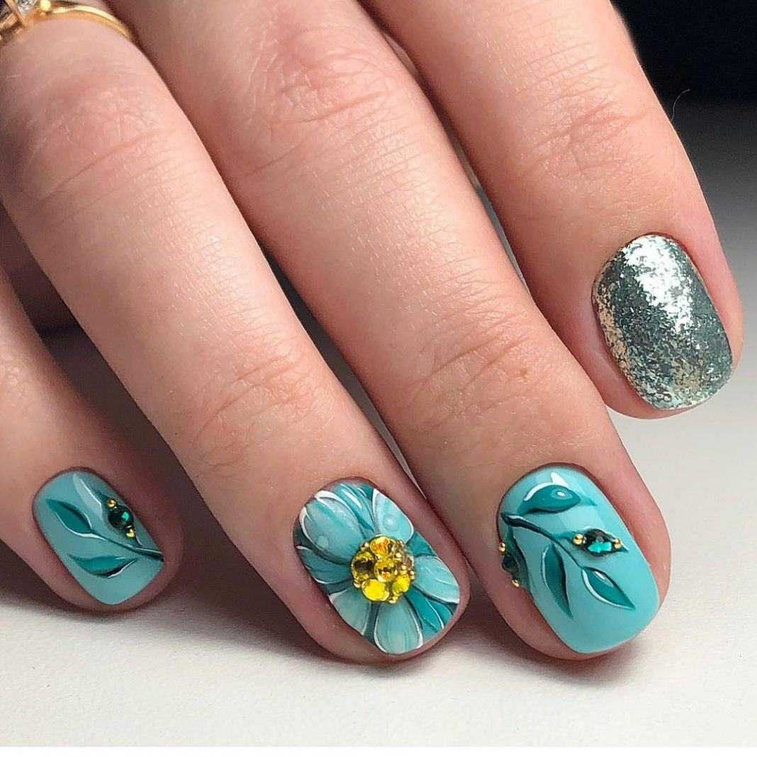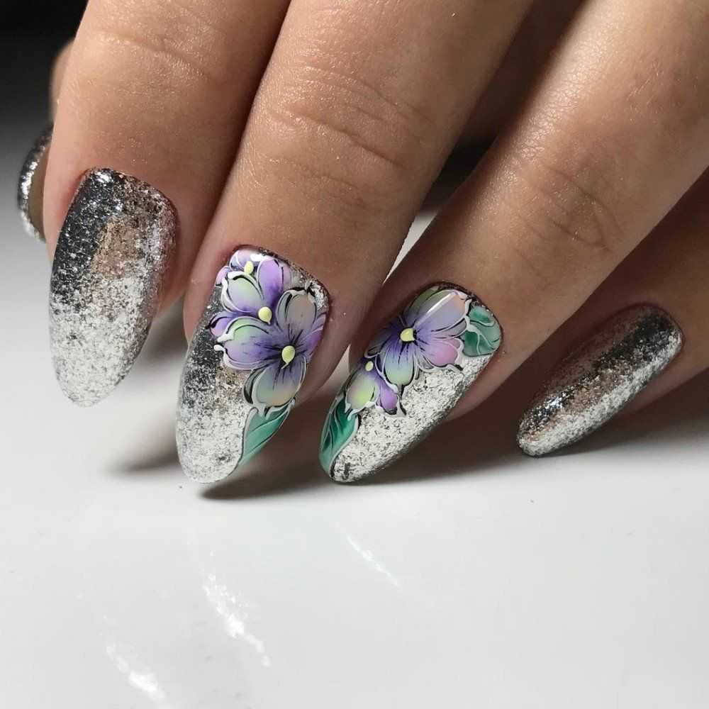 Яркий маникюр отлично смотрится в технике геометрия и флористика. Серебряным или золотым глиттером выделяют отдельные части узора, например, лепестки, бутоны, геометрические формы.