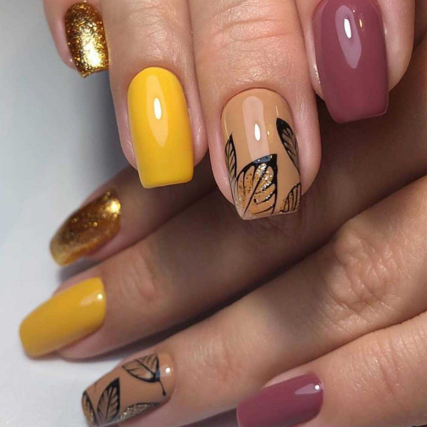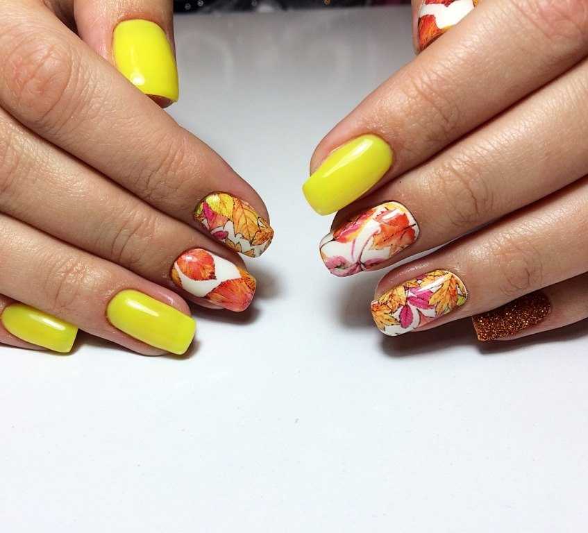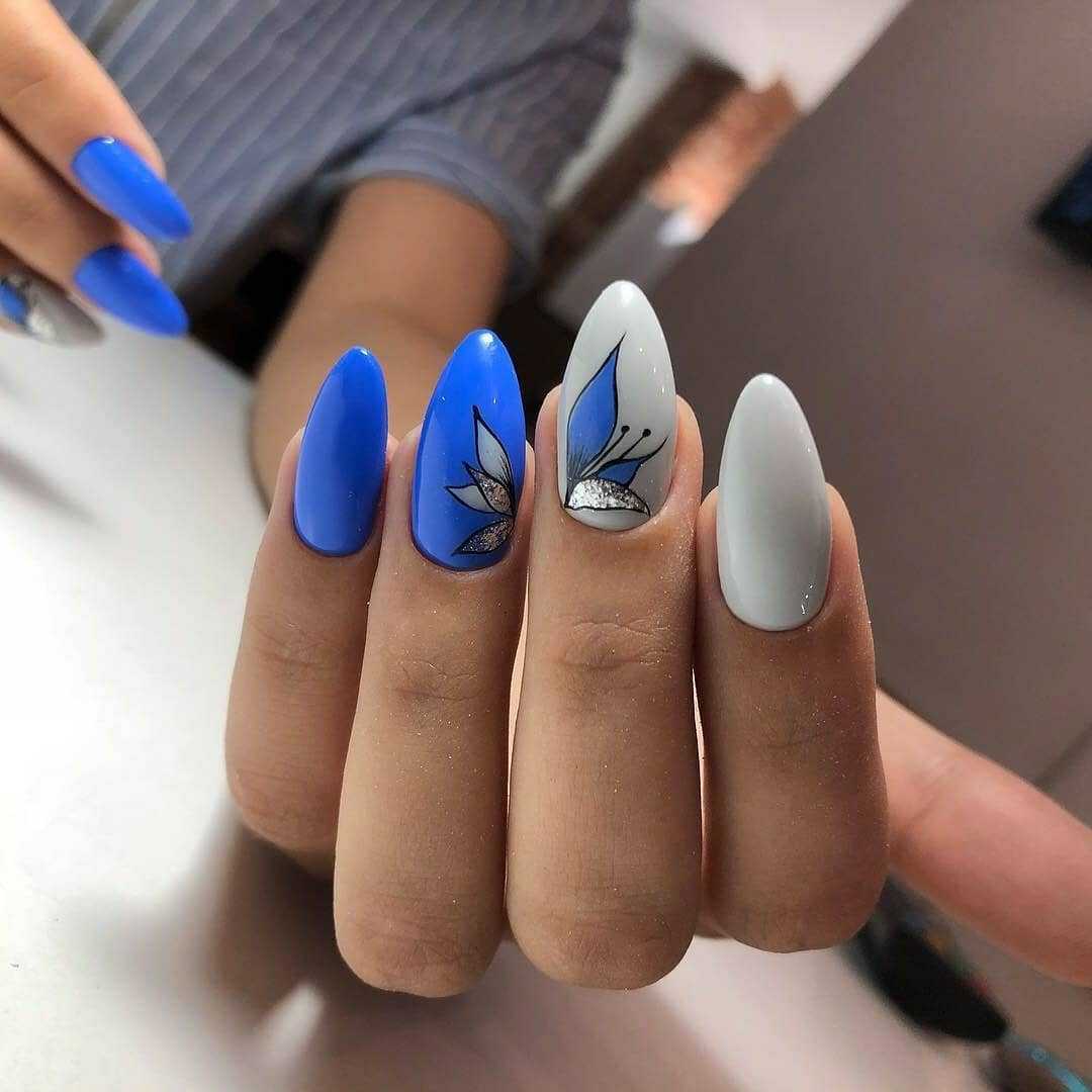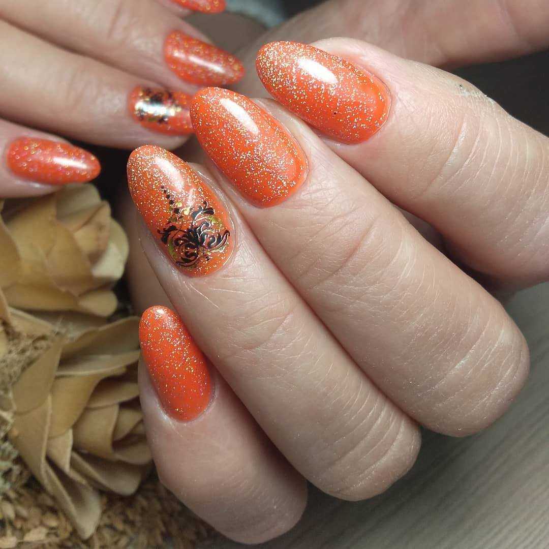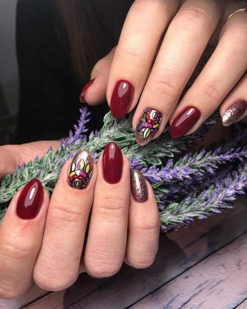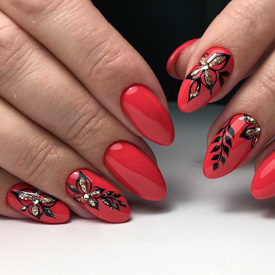 Яркий маникюр отлично смотрится в технике геометрия и флористика. Серебряным или золотым глиттером выделяют отдельные части узора, например, лепестки, бутоны, геометрические формы.