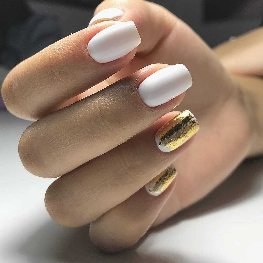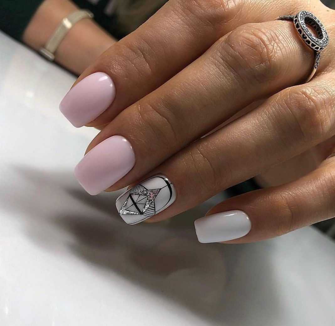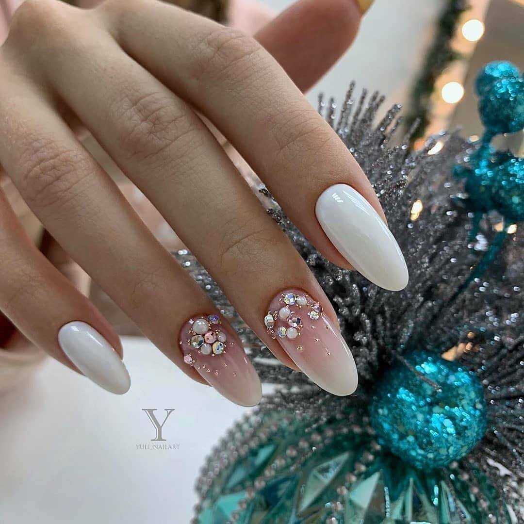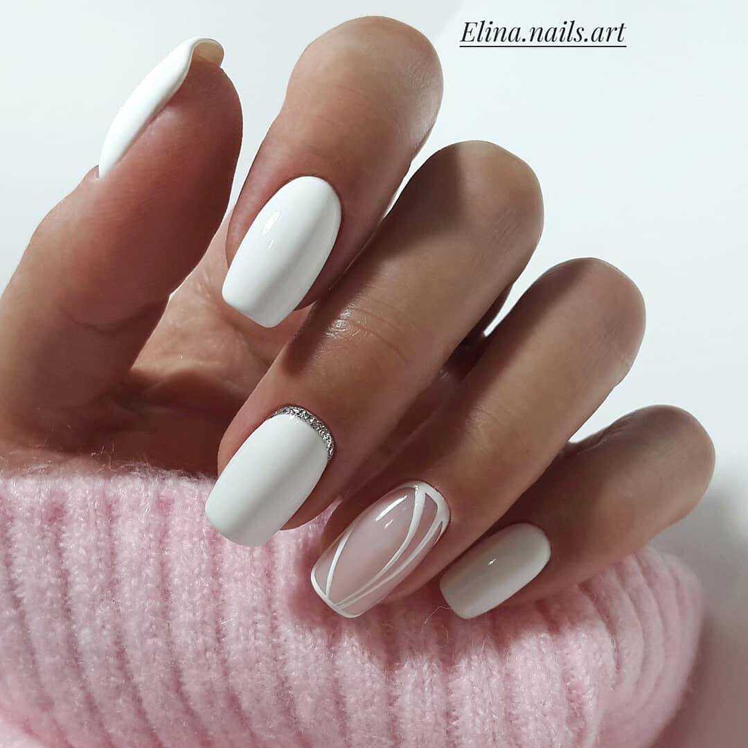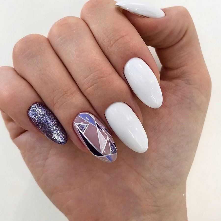 - Классический белый в роли основного цвета плюс украшение одного ногтя геометрическими рисунками или блестками.
