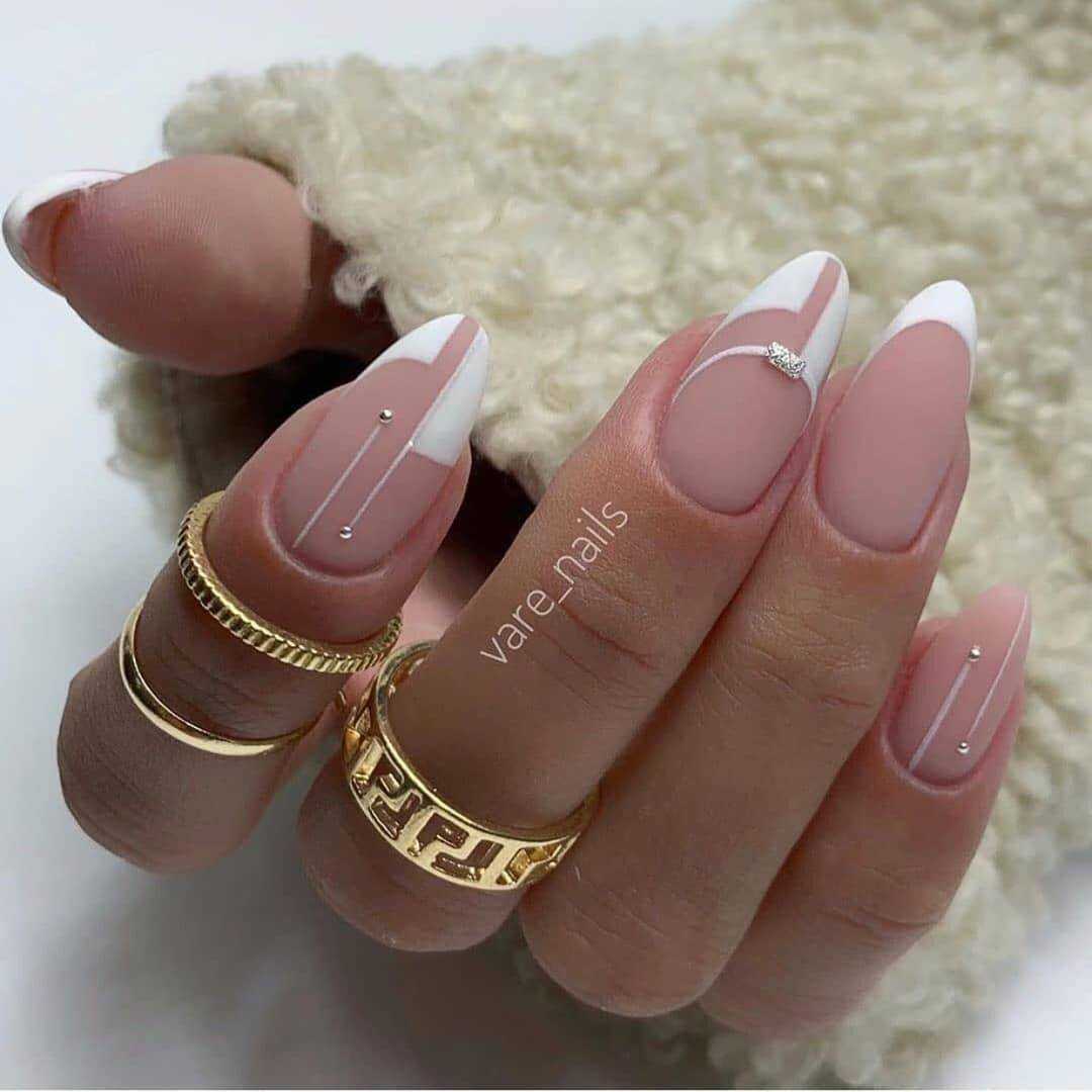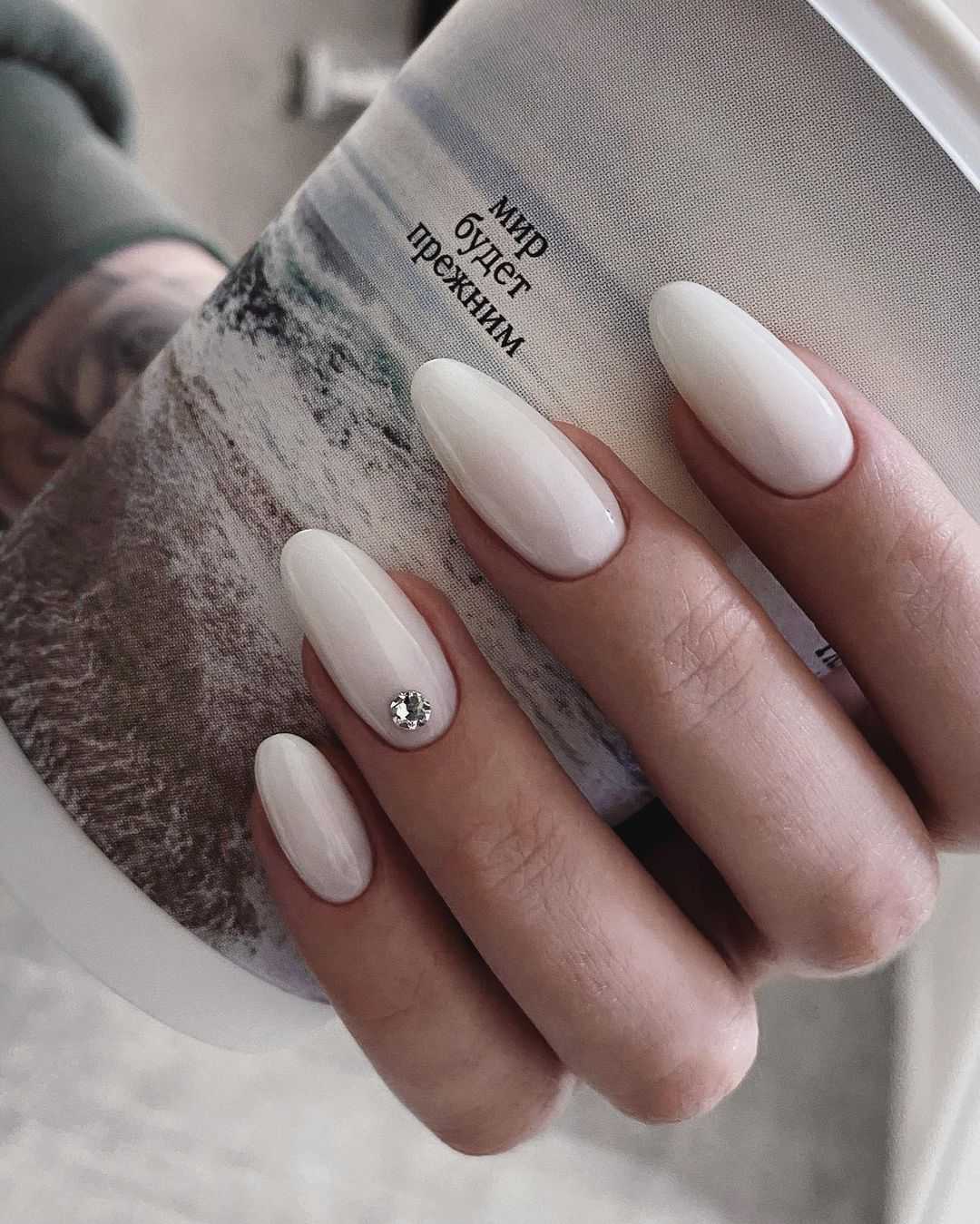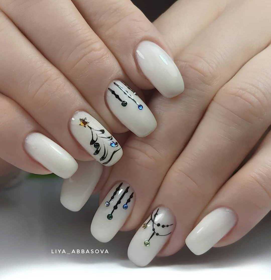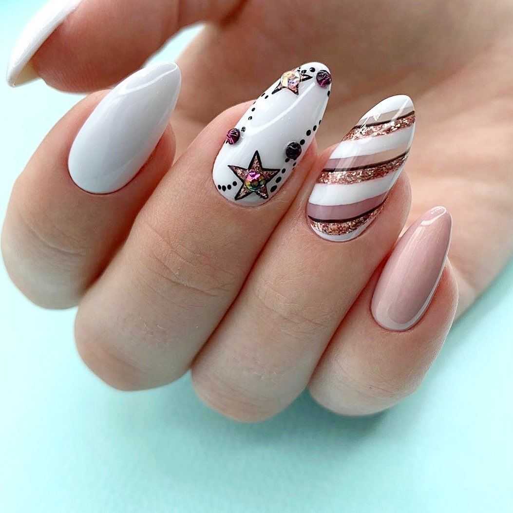 - Классический белый в роли основного цвета плюс украшение одного ногтя геометрическими рисунками или блестками.