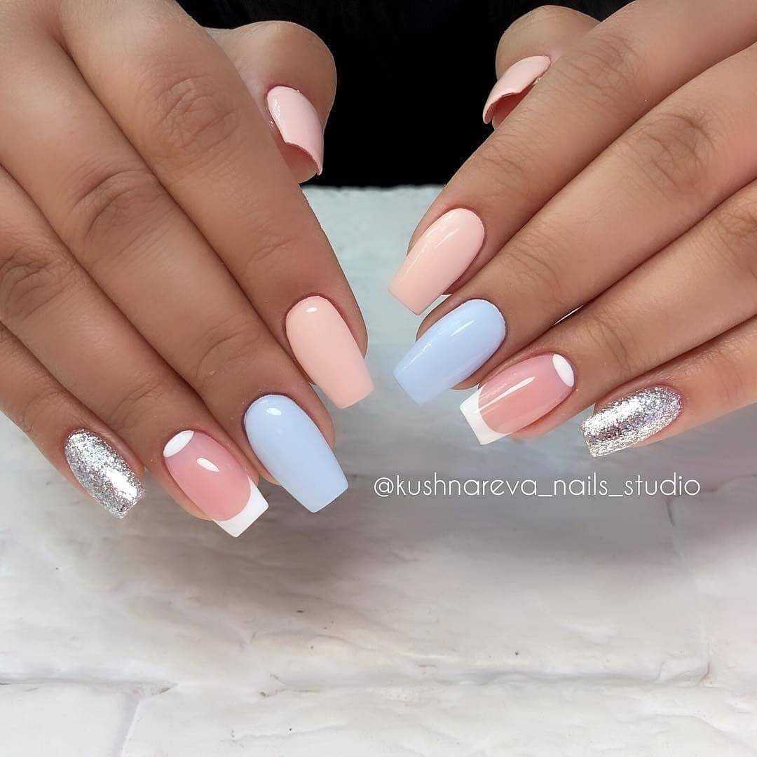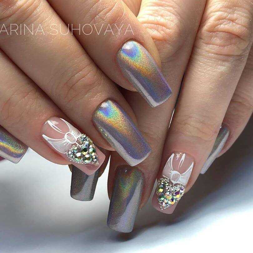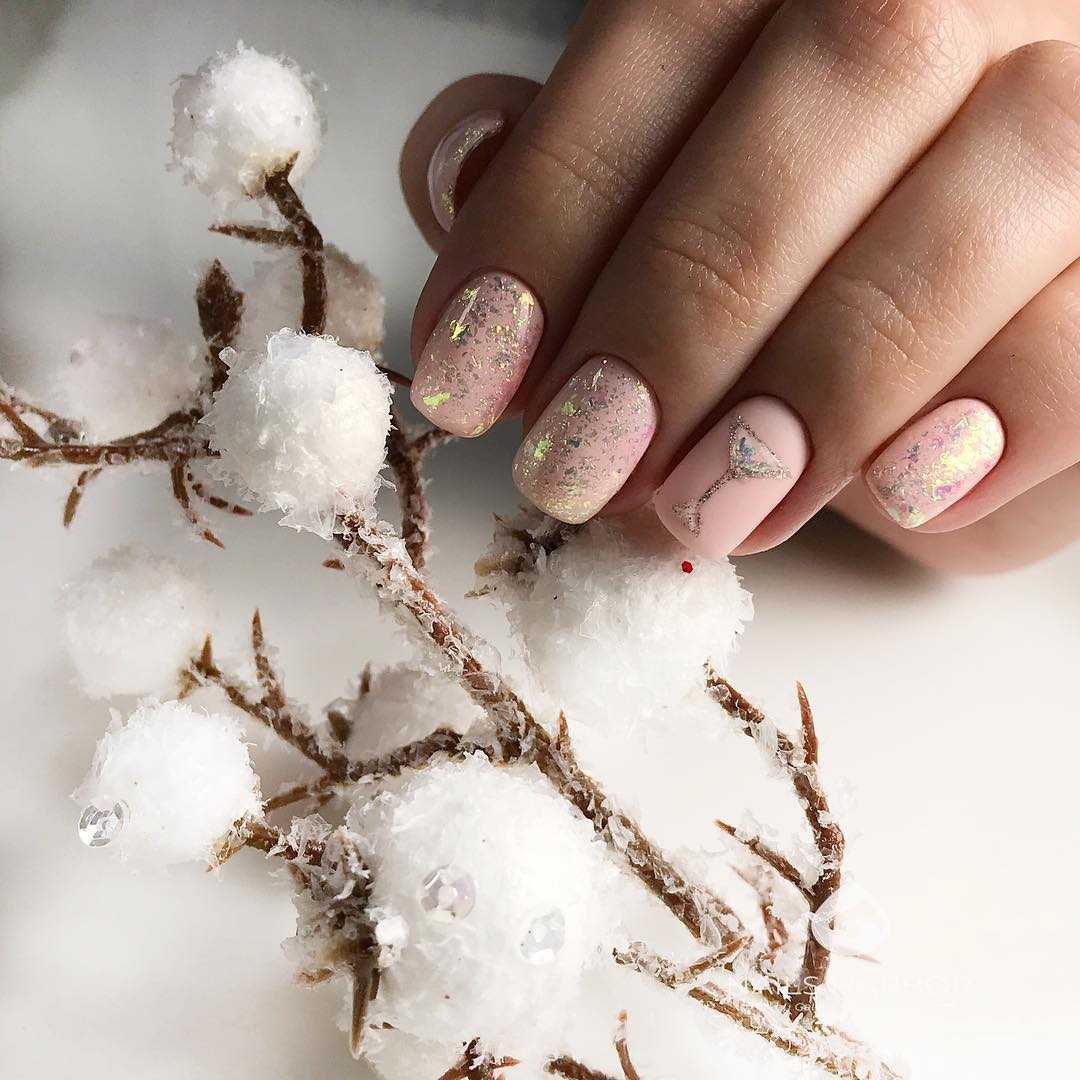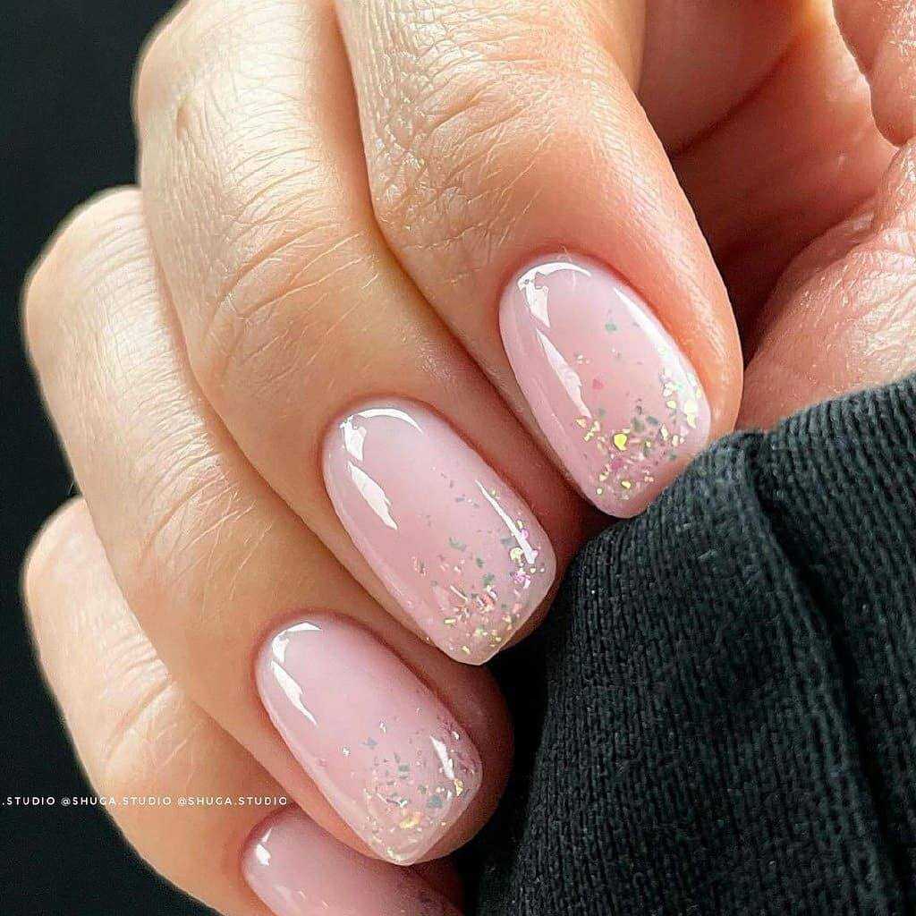 Для основного оттенка используйте нюдовые, пастельные цвета и неяркие блестки. Серебряные или золотые оттенки сверкающих частиц подойдут к любому варианту дизайна.
