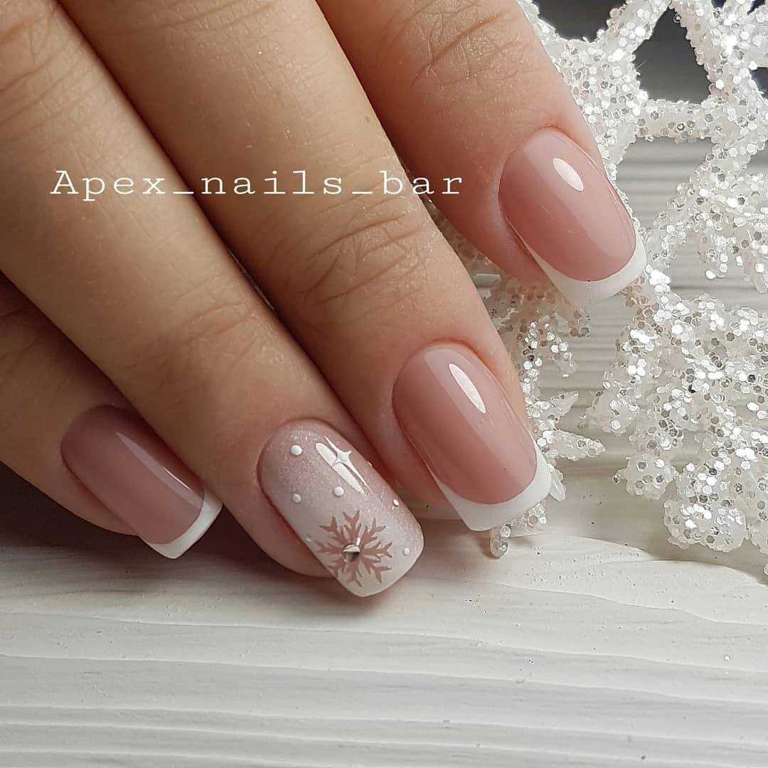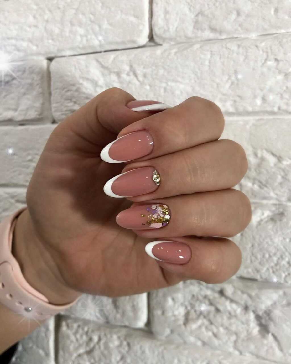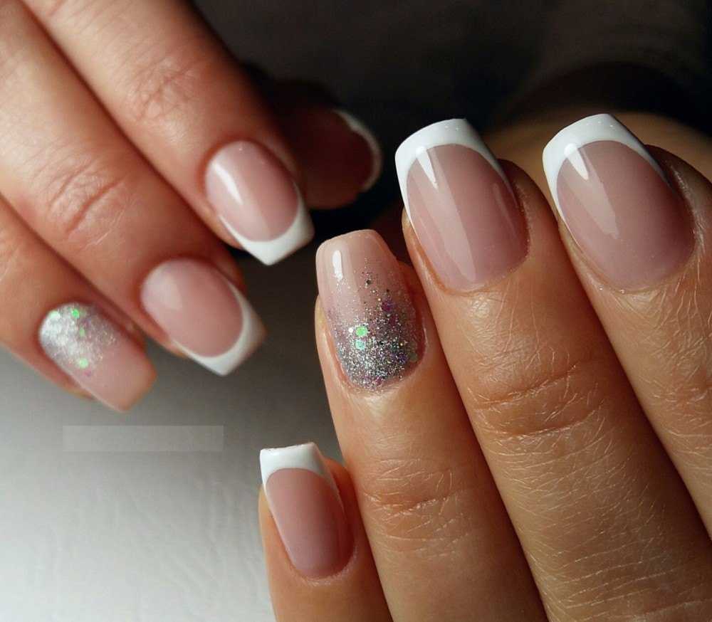 Некоторые нейл-мастера вообще не включают блестящий декор в французский дизайн, а выделяют для него один из ноготков на руке. На него наносится сплошной слой серебряного или золотого глиттера, мелланж с блестками, пайетки.