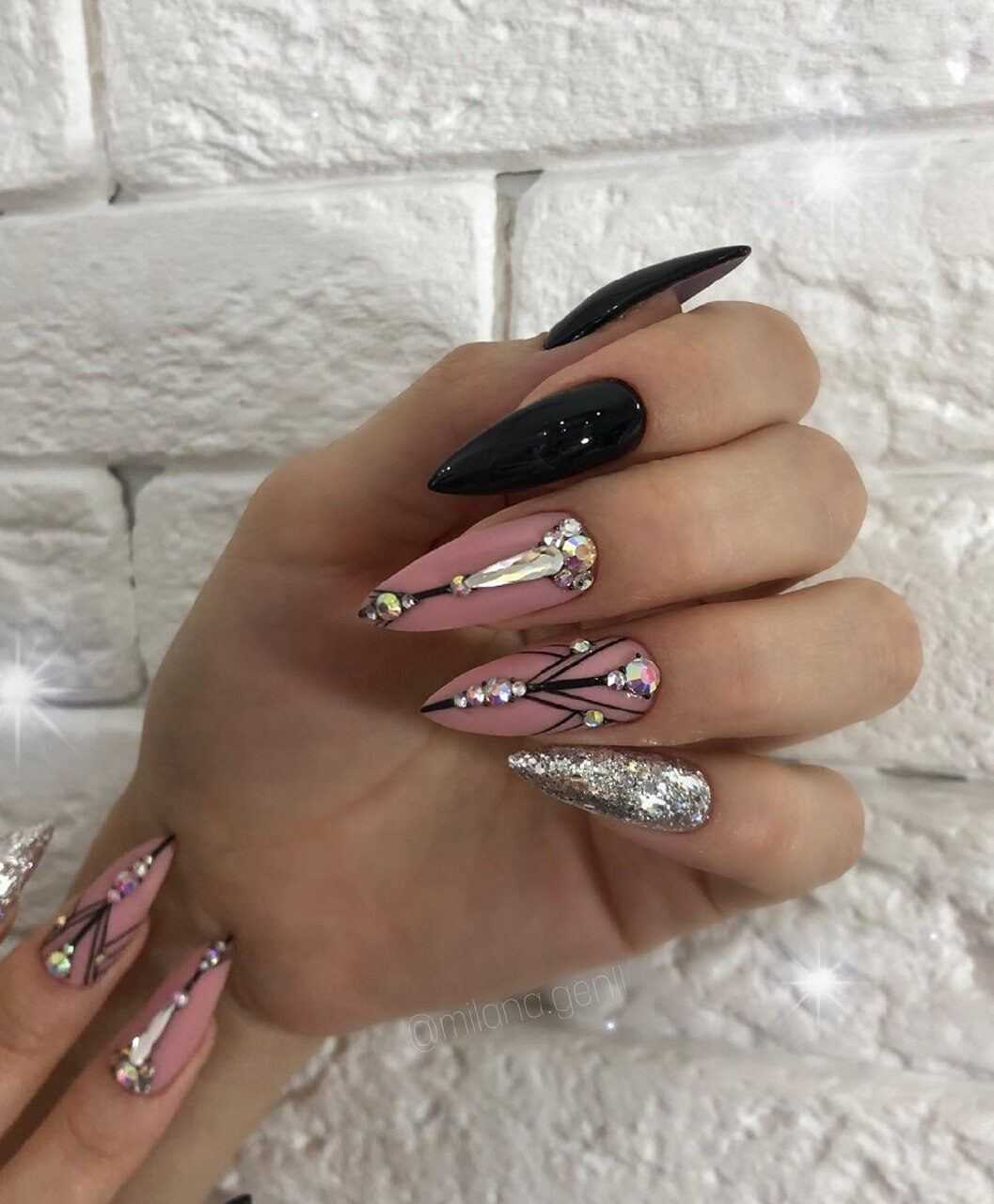 Стразы и блёстки – наиболее популярный декор в нейл-индустрии. Поэтому, вариации маникюра, выполненные с различными вариациями тандемного сочетания стразов и блёсток, всегда занимают топовые позиции. Это может проявляться на одной руке в виде рамок, выполненных глиттером или узоров из стразов, которые чередуются между собой, вариаций прорисовки рисунков блестящими штрихами с дополнением в виде жемчуга, бусин, и многих других идеи. При этом стразы и блёстки могут иметь разную форму, размеры и окрас. Все возможные вариации дизайна в этом случае перечислить просто невозможно.