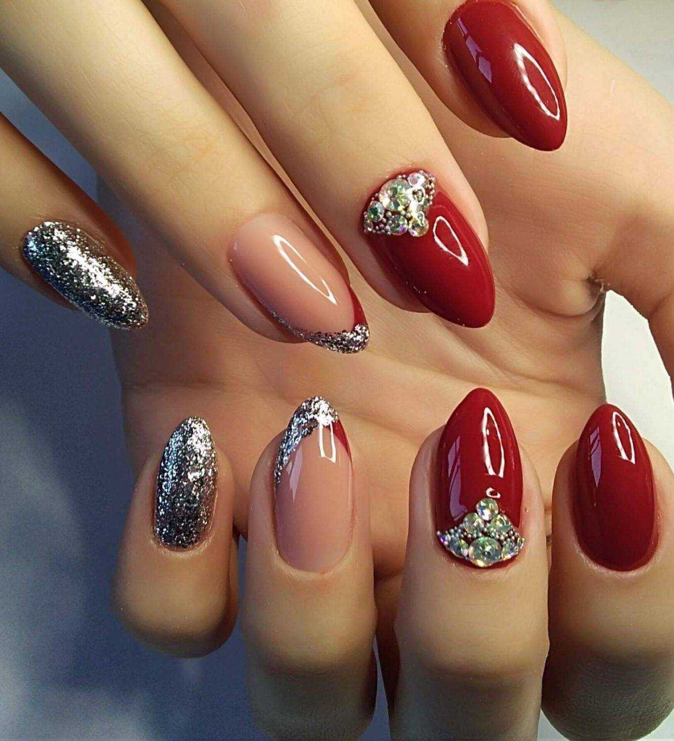 Блестки часто дополняют стразами, бульонками, камнями и другим объемным декором. Это позволяет разнообразить маникюр, сделать его интереснее. Размер и форму стразов выбирайте в зависимости от цели выполнения маникюра. Если речь идет о повседневных нейл-артах, то камни лучше расположить в прикорневой зоне одного из ноготков. В торжественных нейл-артах выполните выкладку стразами на безымянном пальце, а остальные ноготки окрасьте в однотонный яркий оттенок.