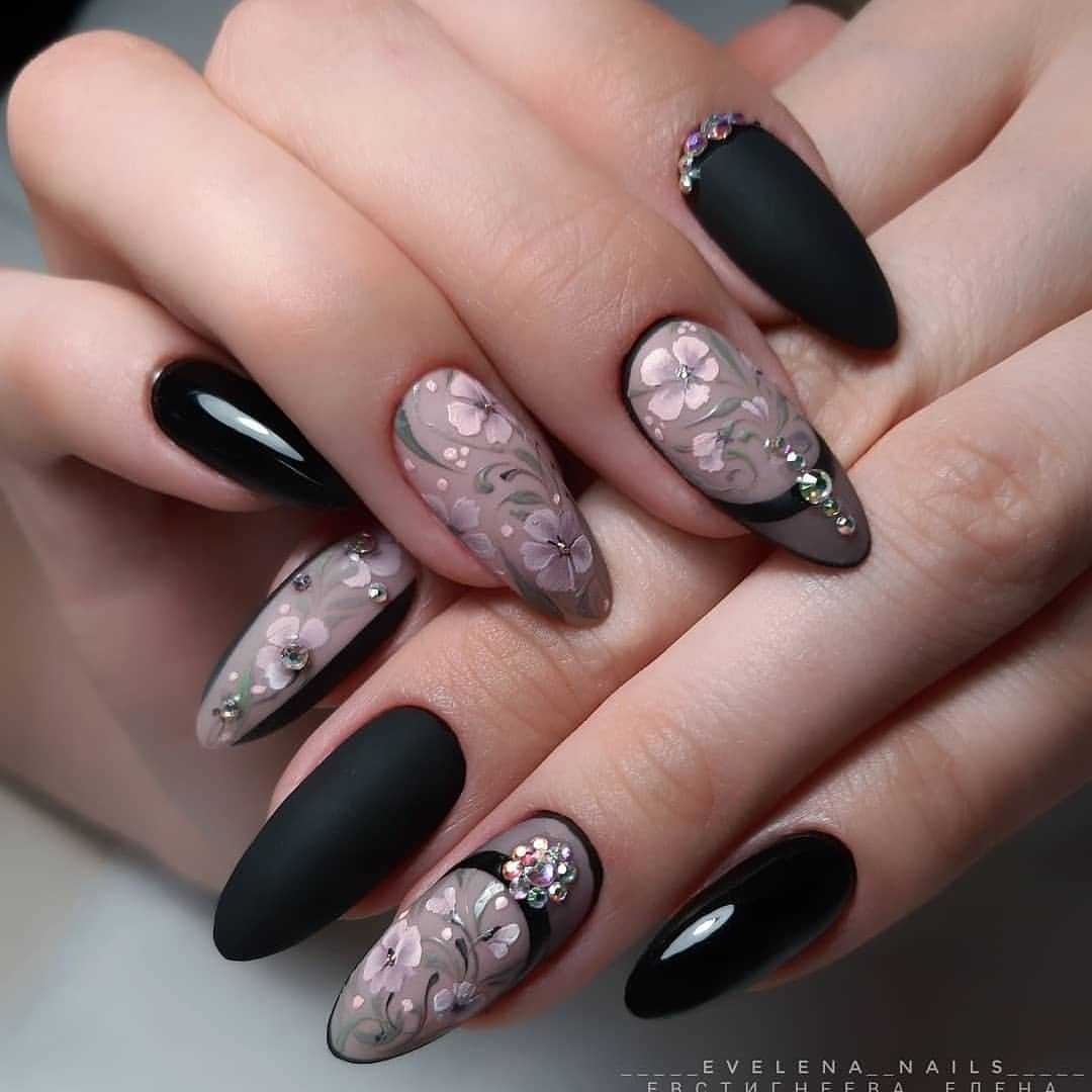 Женственность – это то, к чему стремятся все современные дамы. Подчеркнуть ее можно с помощью изумительного маникюра с флористическим дизайном. Тонкие веточки с листочками, изящные бутоны или крупные цветы – все это выглядит невероятно красиво независимо от того, какого цвета будет основное покрытие. Главное – подбирать оптимального размера изображение, чтобы оно дополняло и подчеркивало привлекательность маникюра. Блестки в данном случае играют немаловажную роль. Поскольку с их помощью можно украсить лепестки или сделать акцент на другой части рисунка.
