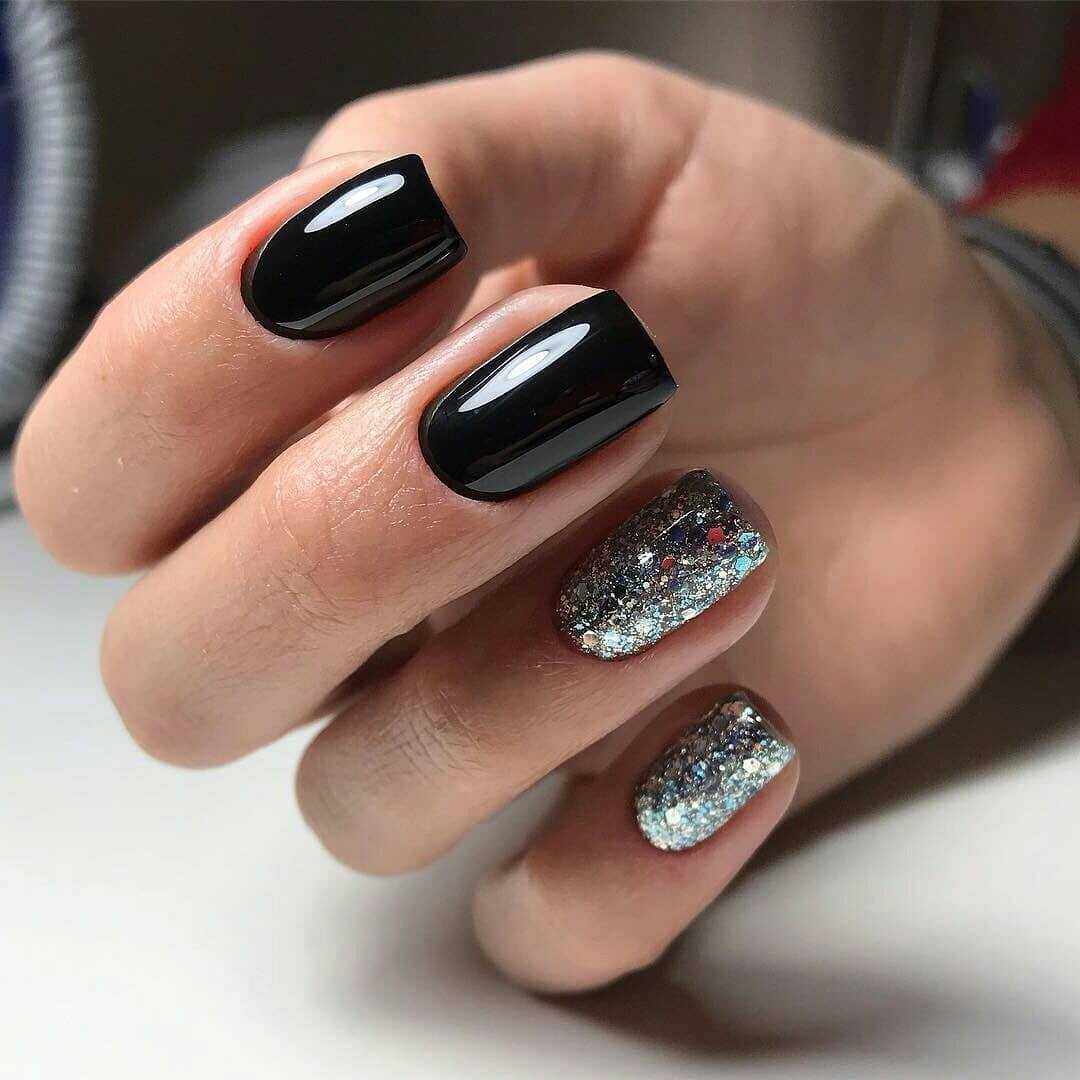 Для вечернего лука оптимальным станет покрытие черным гель-лаком с глиттером на одном или двух ногтях.