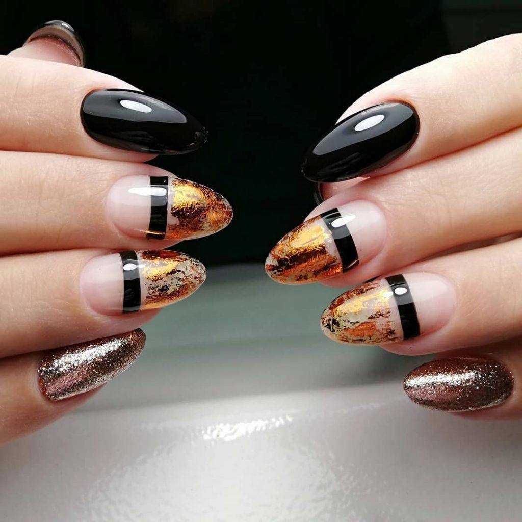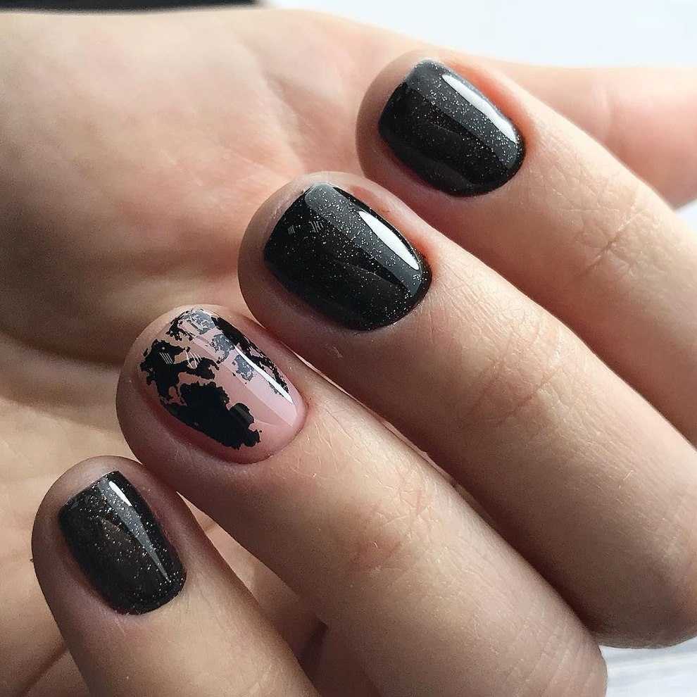 Отличным вариантом дизайна станет следующее оформление – мизинчик и средний палец выделить мраморным рисунком, на безымянном сделать акцент с помощью глиттера по всей поверхности, а остальные ногти покрыть черным гель-лаком.