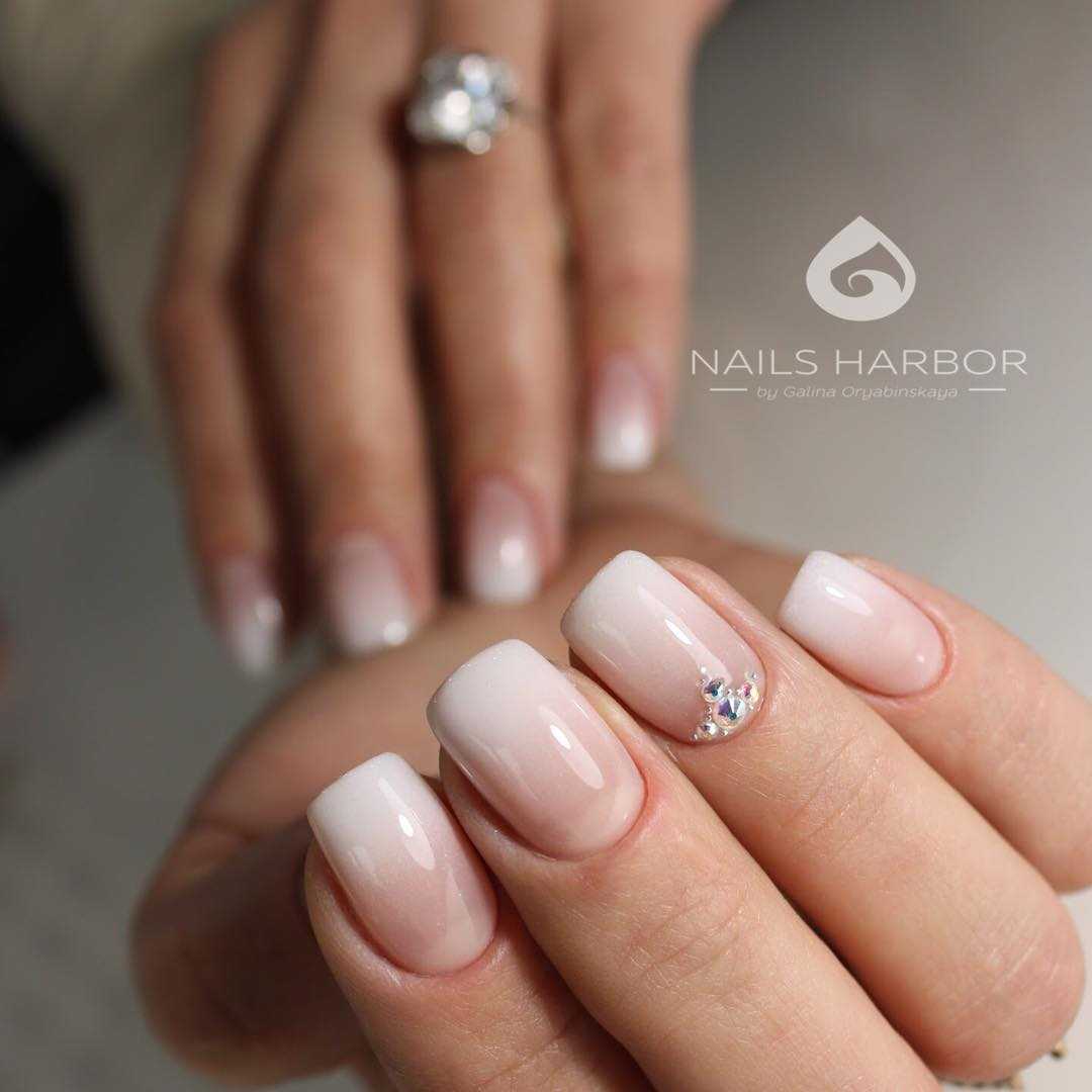 Во французском маникюре важно не переборщить с блестящим декором, ведь основной акцент сделан все же на плавных линиях по краю ногтя. Чтобы дизайн смотрелся еще элегантнее, выполните френч в градиентной технике