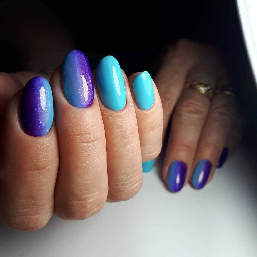Шикарные переходы цветов на пальчиках – это один из стопроцентных способов привлечения внимания. Особенно хороши на ноготках контрастные сочетания. Лак в этом случае может плавно переходить в более тёмный и глубокий цвет, например, тёмно-бордовый, коричневый, чёрный, или, наоборот, в более светлый. В таком варианте блёстками следует выделить полностью один акцентный ноготок. Очень оригинально смотрится растяжка, выполненная непосредственно блестящими частичками. Нанесите декор на кончик или основание ноготка и аккуратно распределите блёстки по всей поверхности ногтевой пластины, оставляя на выбранном участке большее количество элементов. Декор может быть золотым, серебристым, синим, чёрным, сиреневым и любым другим.