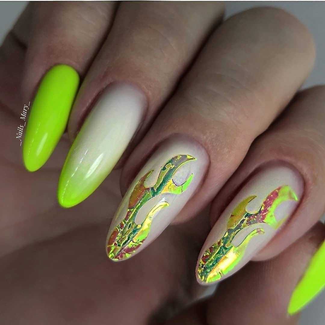В весенне-летнем сезоне особую популярность набирает яркий или даже неоновый маникюр. Еще бы, ведь каждой моднице хочется добавить в образ заметных акцентов. В таком случае желтое, оранжевое, сиреневое, красное и синее покрытие — идеальное решение в 2020 году. Только представьте, насколько красиво такой маникюр смотрится с рисунком. Интересно, что его можно выбирать по собственному предпочтению или даже сделать самостоятельно