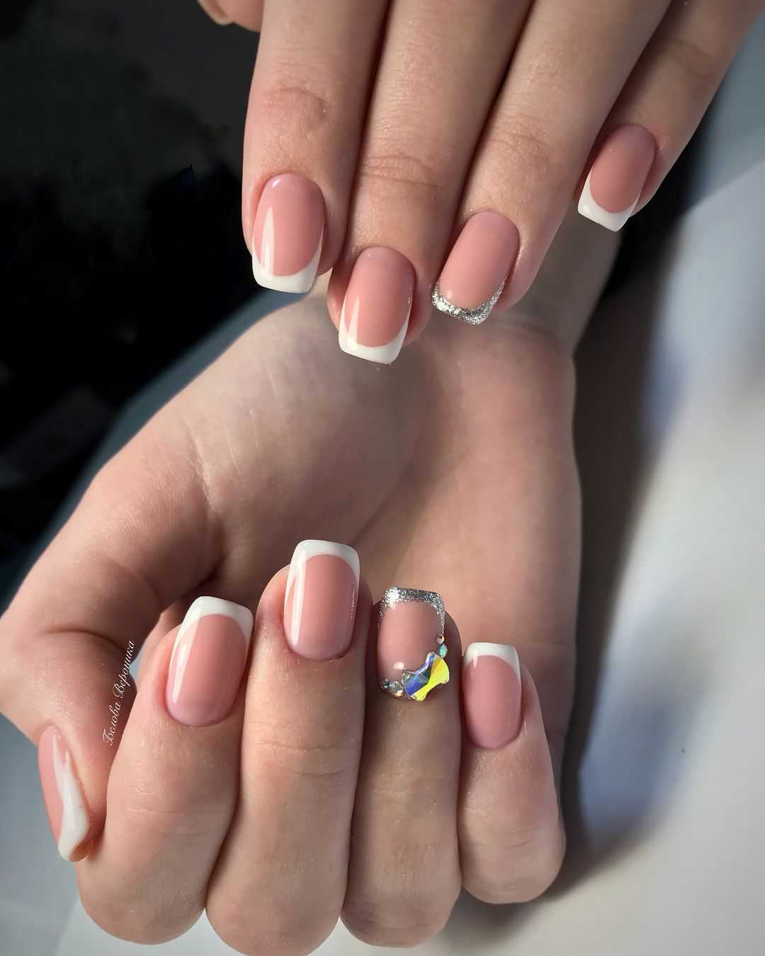 Френч маникюр с блестками станет хорошим вариантом на короткие ногти. Деликатно выполненная работа сделает простой, на первый взгляд, результат шедевром искусства.