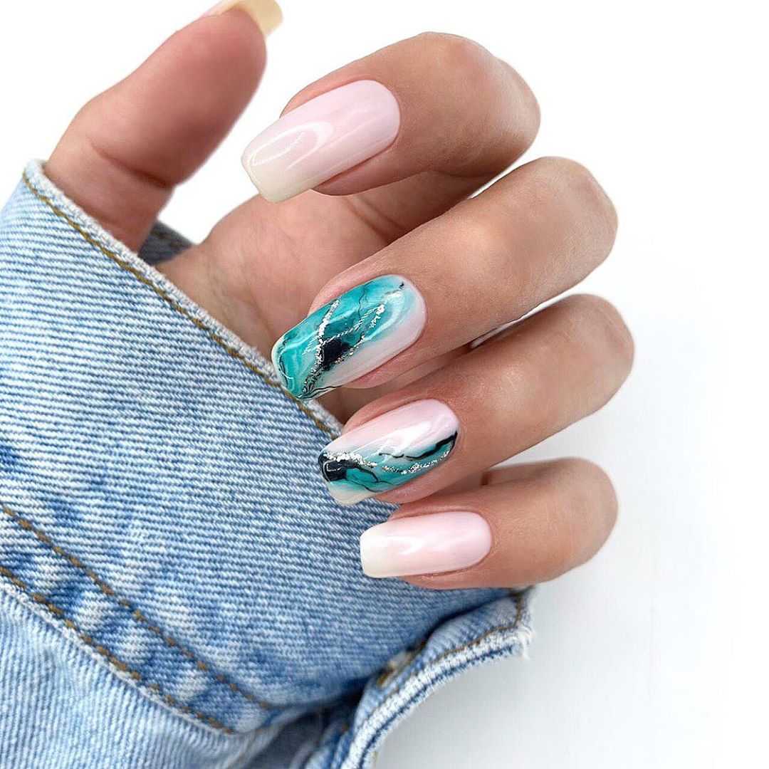Мраморный дизайн захватывает дыхание, а в сочетании с блестящим глиттером создает самые модные тенденции сезона. Блестки служат украшением для средних или же длинных ноготков.