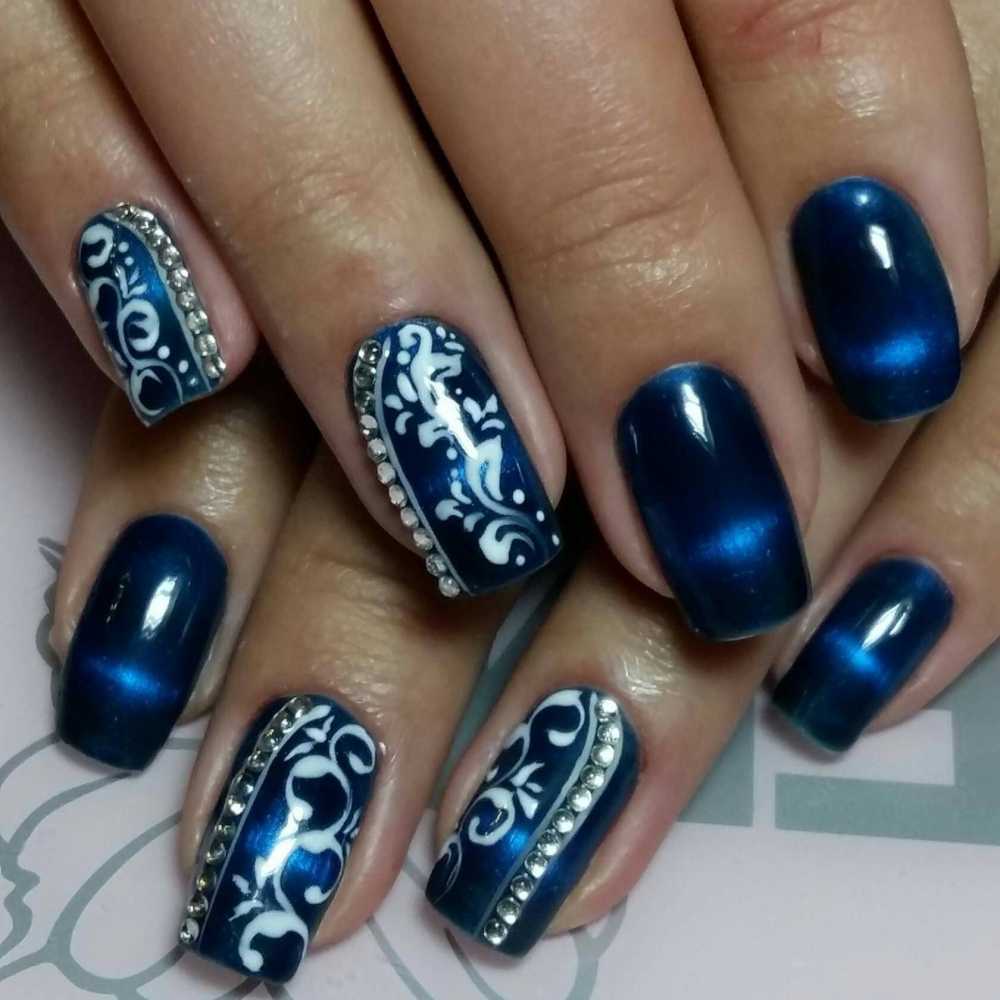 Разнообразить кошачий глаз можно различными камнями или стразами. Поскольку сам дизайн очень яркий и имеет блестящие детали, стразов не должно быть слишком много. Можно сделать акцент на одном или двух пальцах и добавить стразы на верх тарелки.