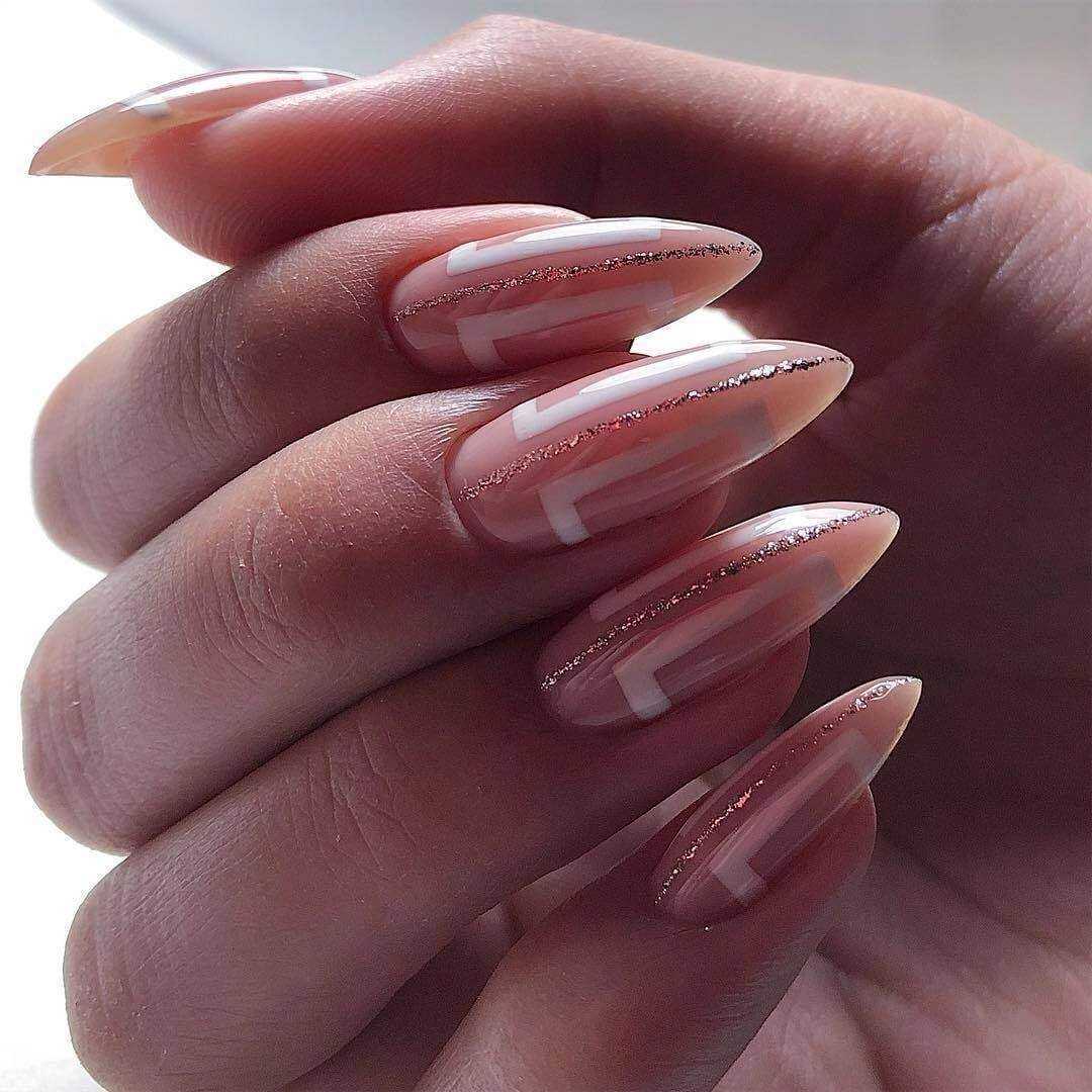 На миндальных ногтях рекомендуется выполнять минималистичный декор блестками и стразами. Присмотритесь к нейл-артам с полосками, выложенным из стразов или украшенным глиттером. Интересно смотрится лунный маникюр с глиттером в прикорневой зоне.