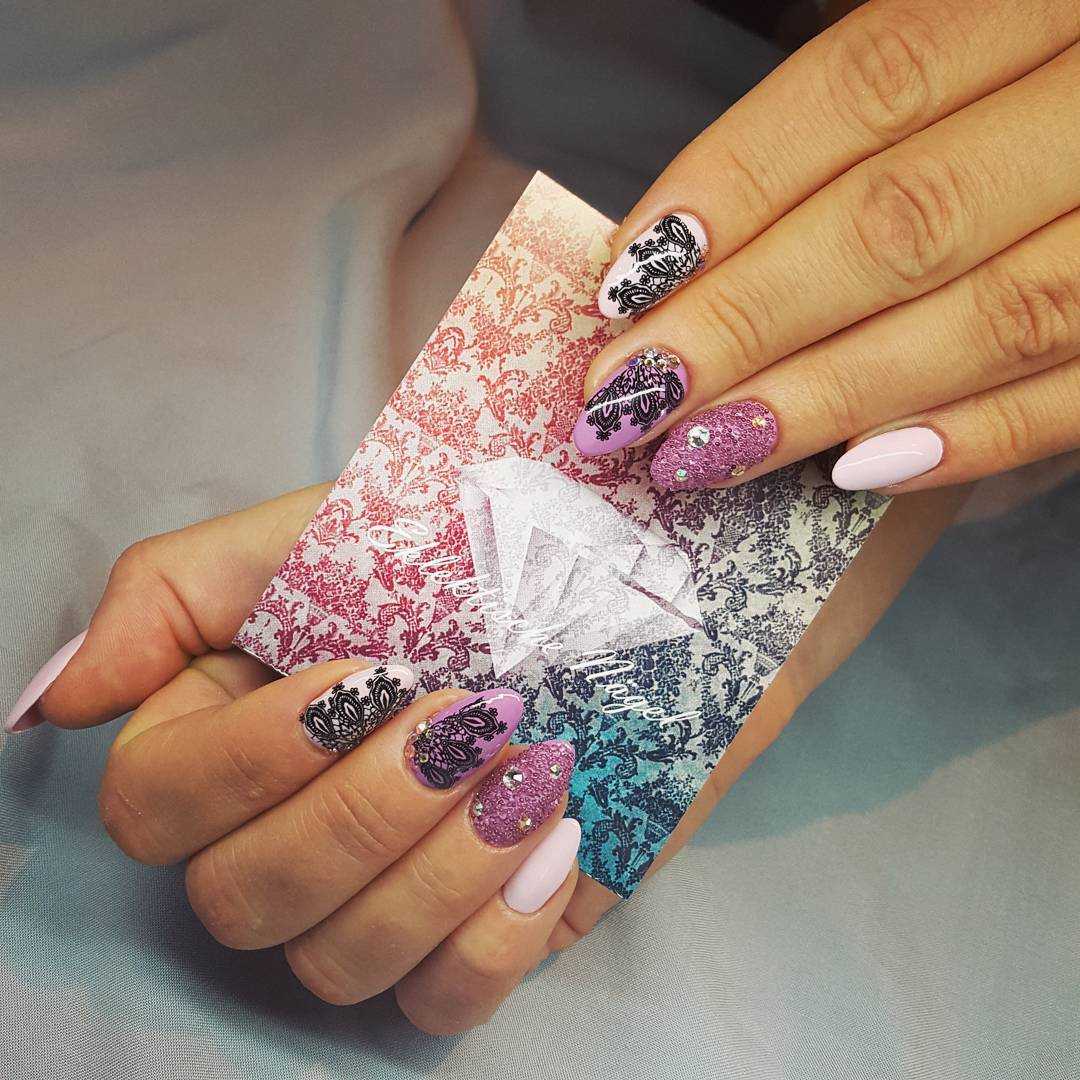 В тренде однотонное покрытие, дизайн с растяжкой блестками, французский и лунный маникюр, дизайн с блестками и стразами. На миндальной форме красиво смотрится дизайн с фольгированными лентами. Такой маникюр шикарно смотрится в повседневных и деловых образах, выдает в своей обладательнице утонченную натуру.