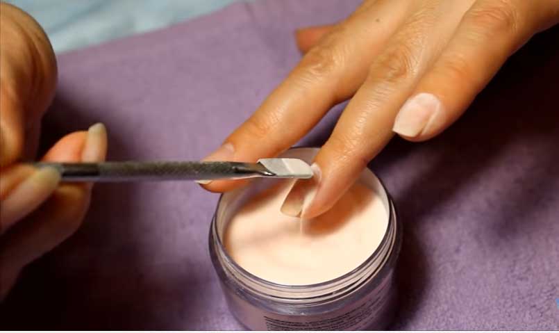 - Дальше необходимо покрыть поверхность базой. Не просушивая базу под лампой, принимаемся за укрепление. Щедро посыпаем ноготки акриловой пудрой, с помощью кисти или лопаткой для маникюра. Старайтесь это делать над посудой, где лежит порошок. Чтобы излишки ссыпались туда же. При этом, обязательно поворачиваем ноготки, так, чтобы средство покрывало всю базу.