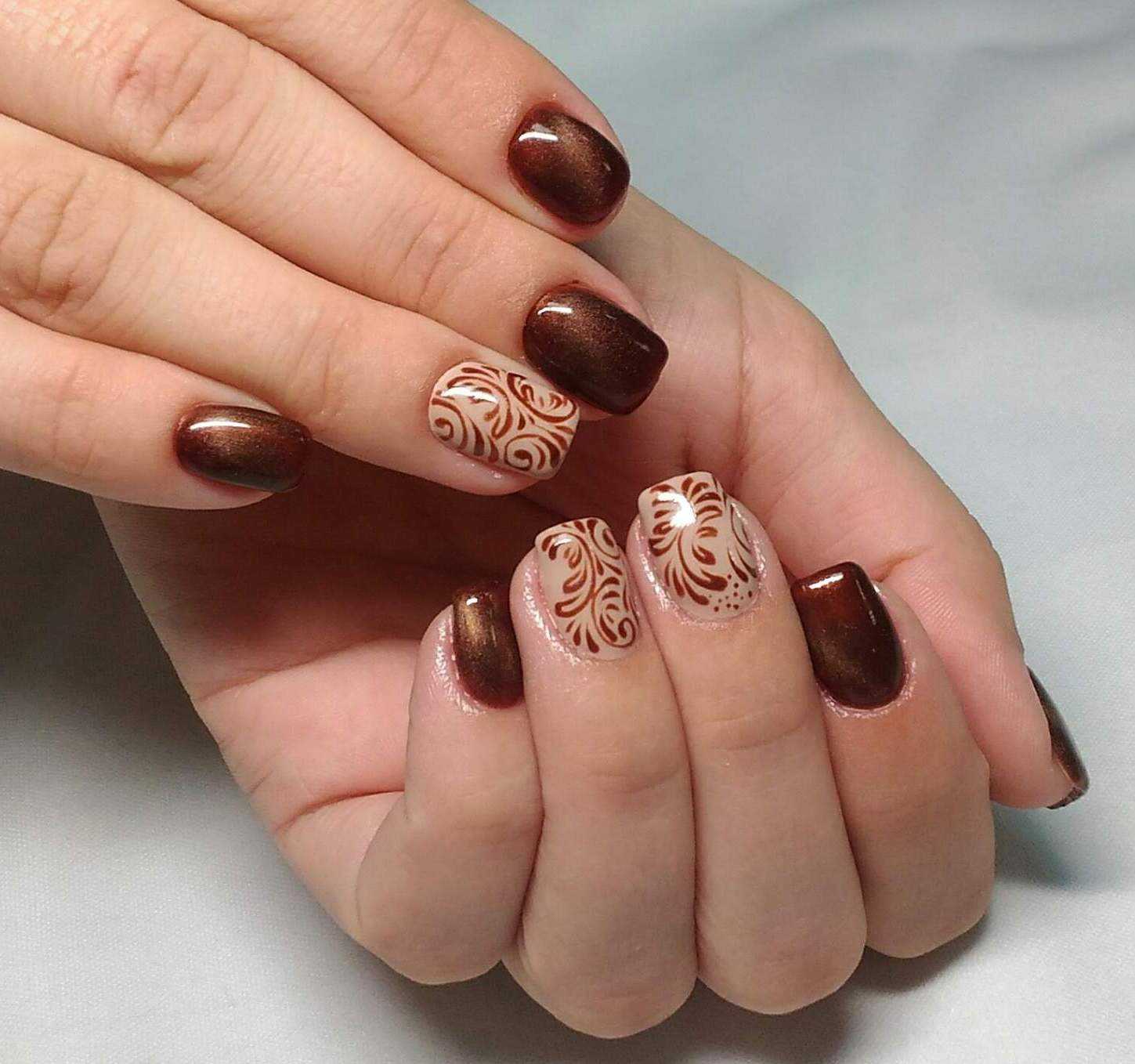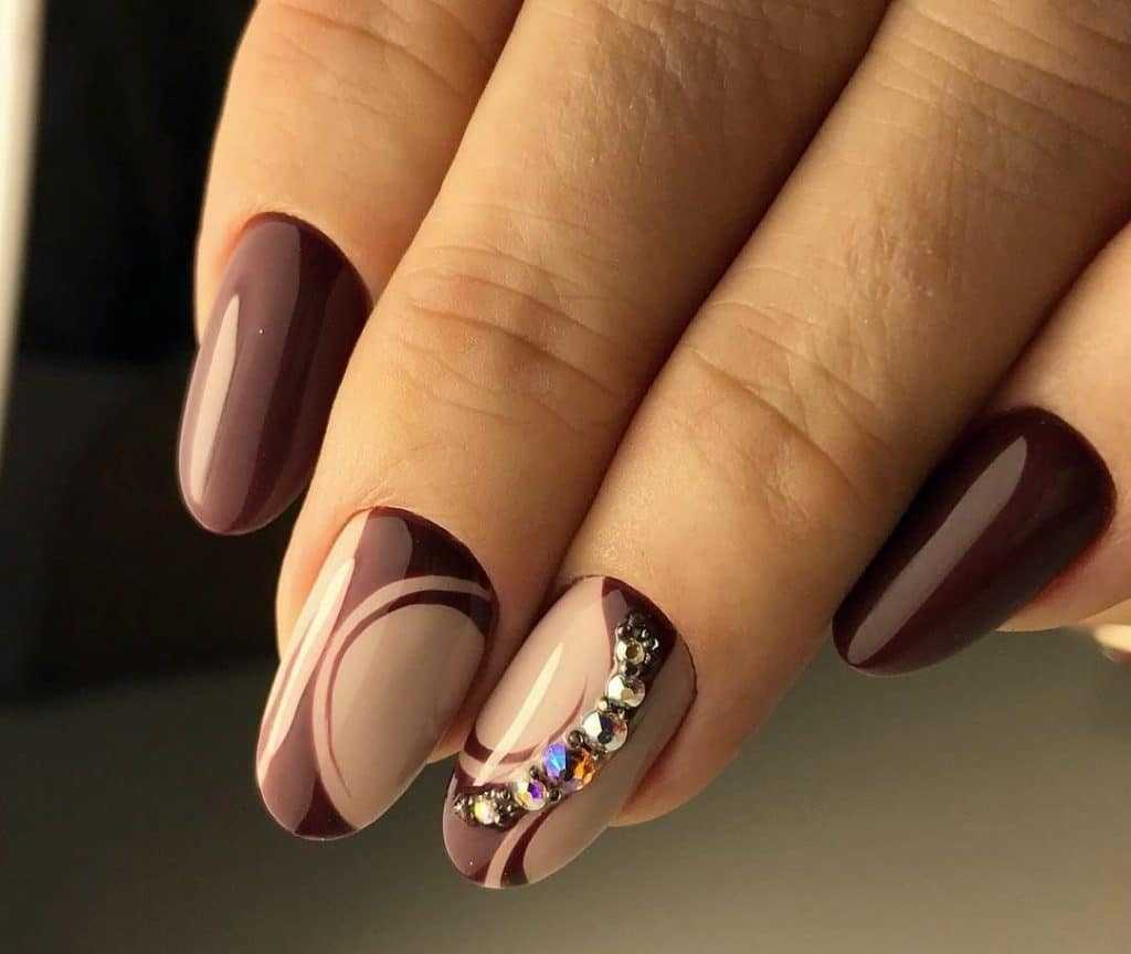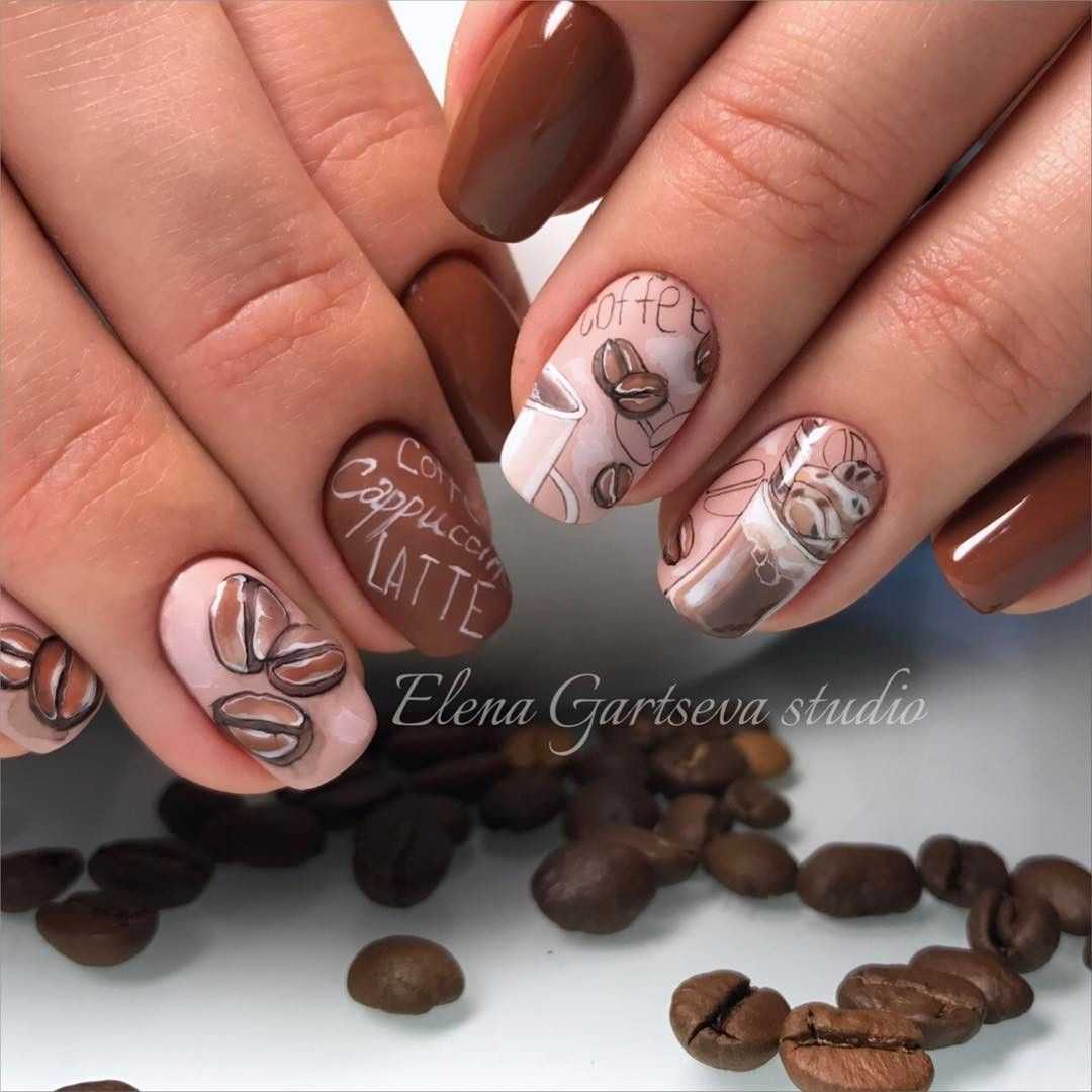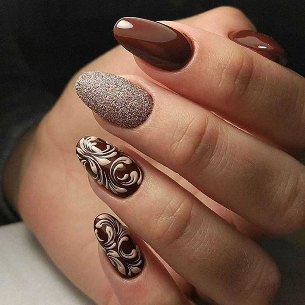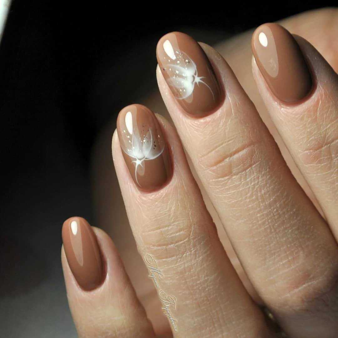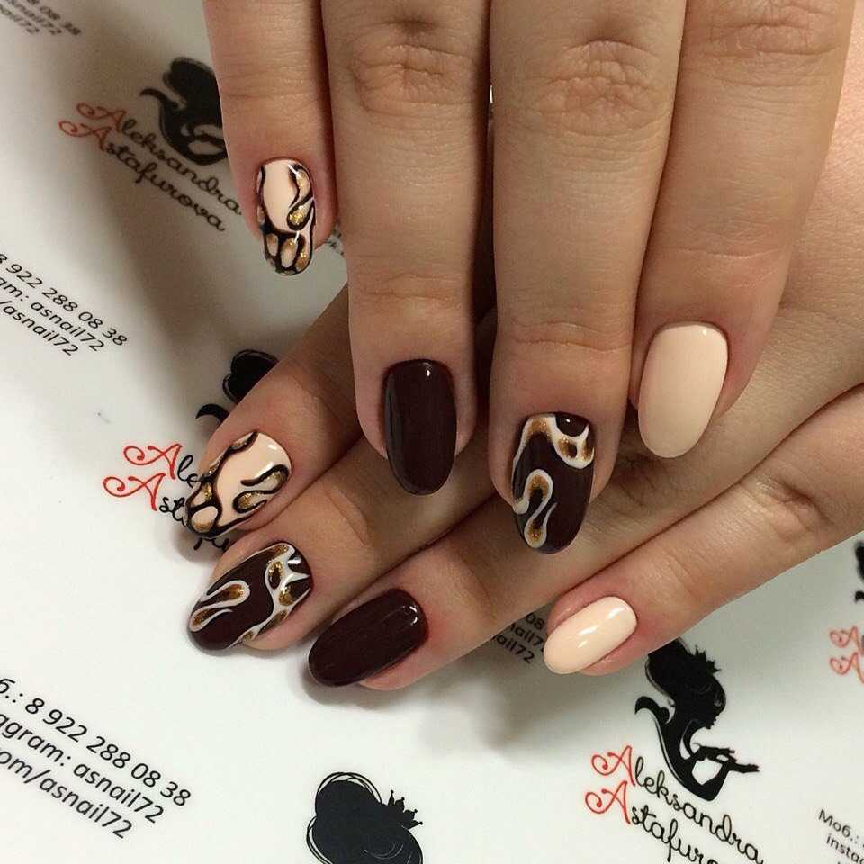 Коричневый маникюр с интересным дизайном и рисунками