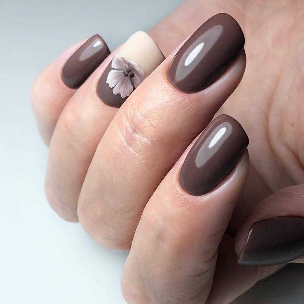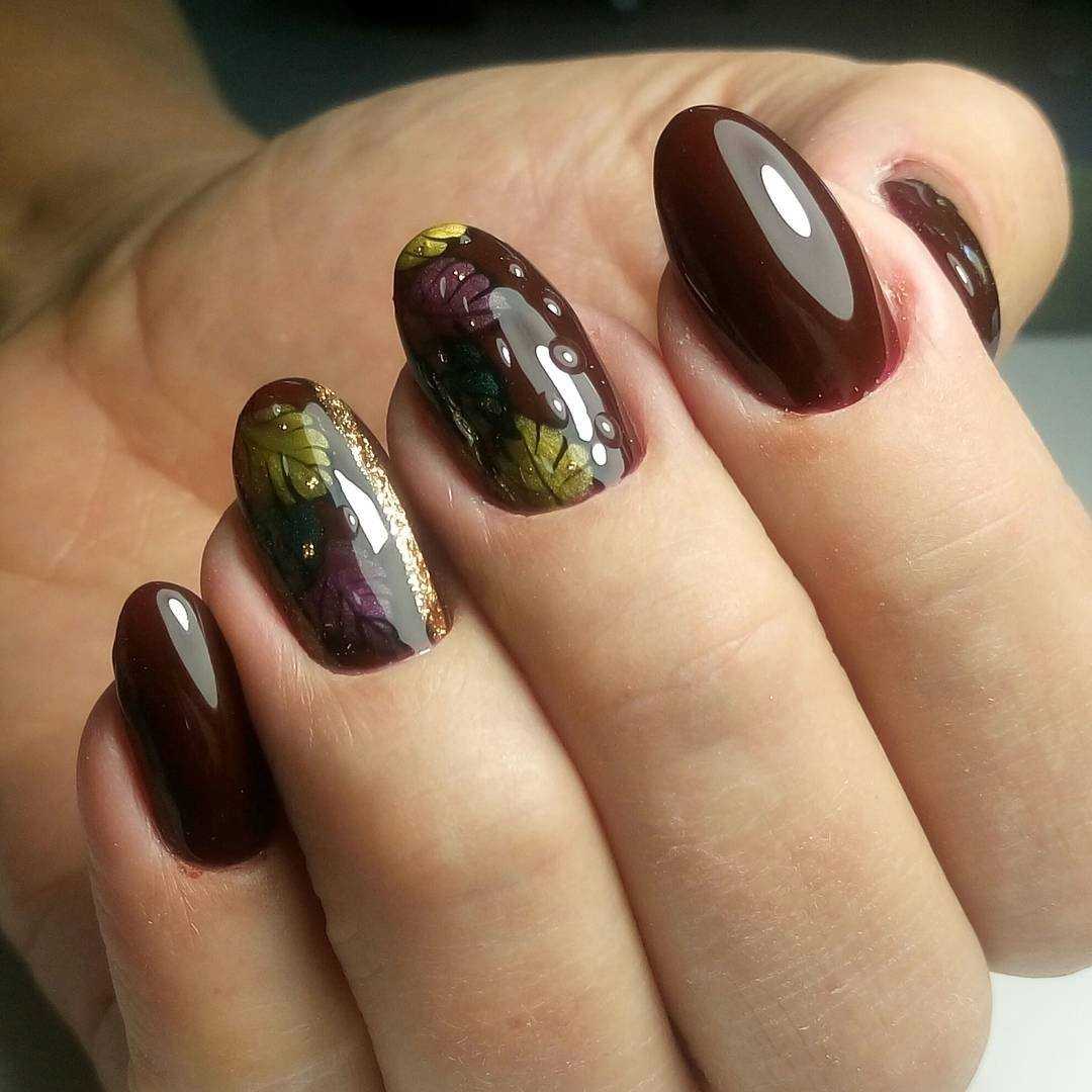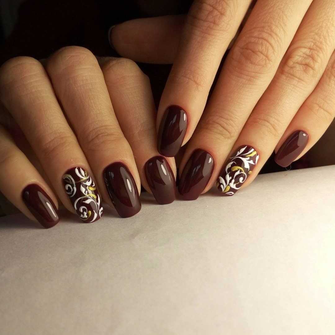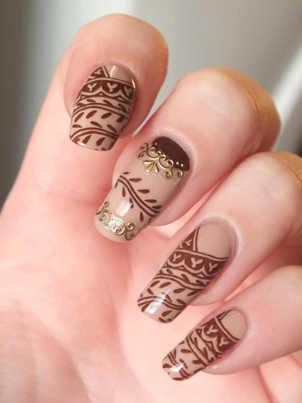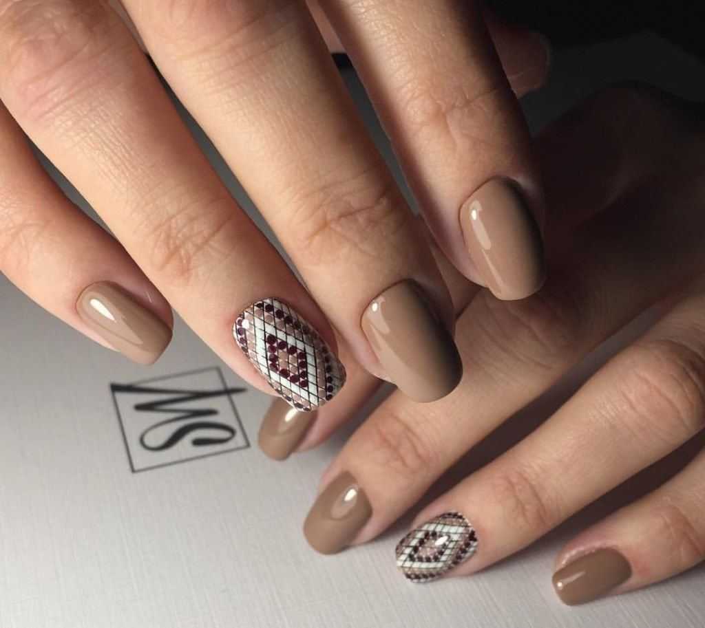 Коричневый маникюр с интересным дизайном и рисунками