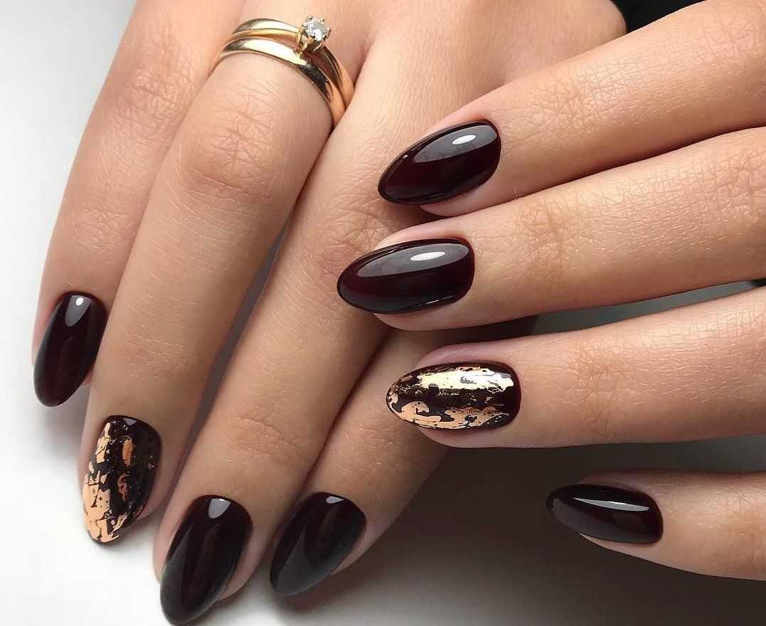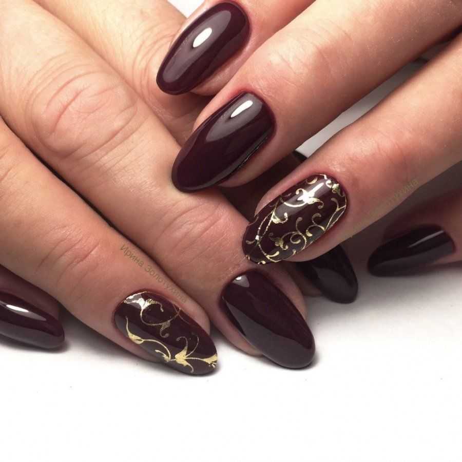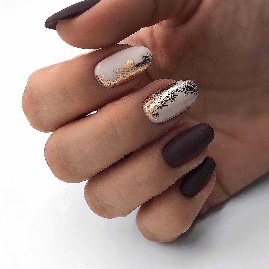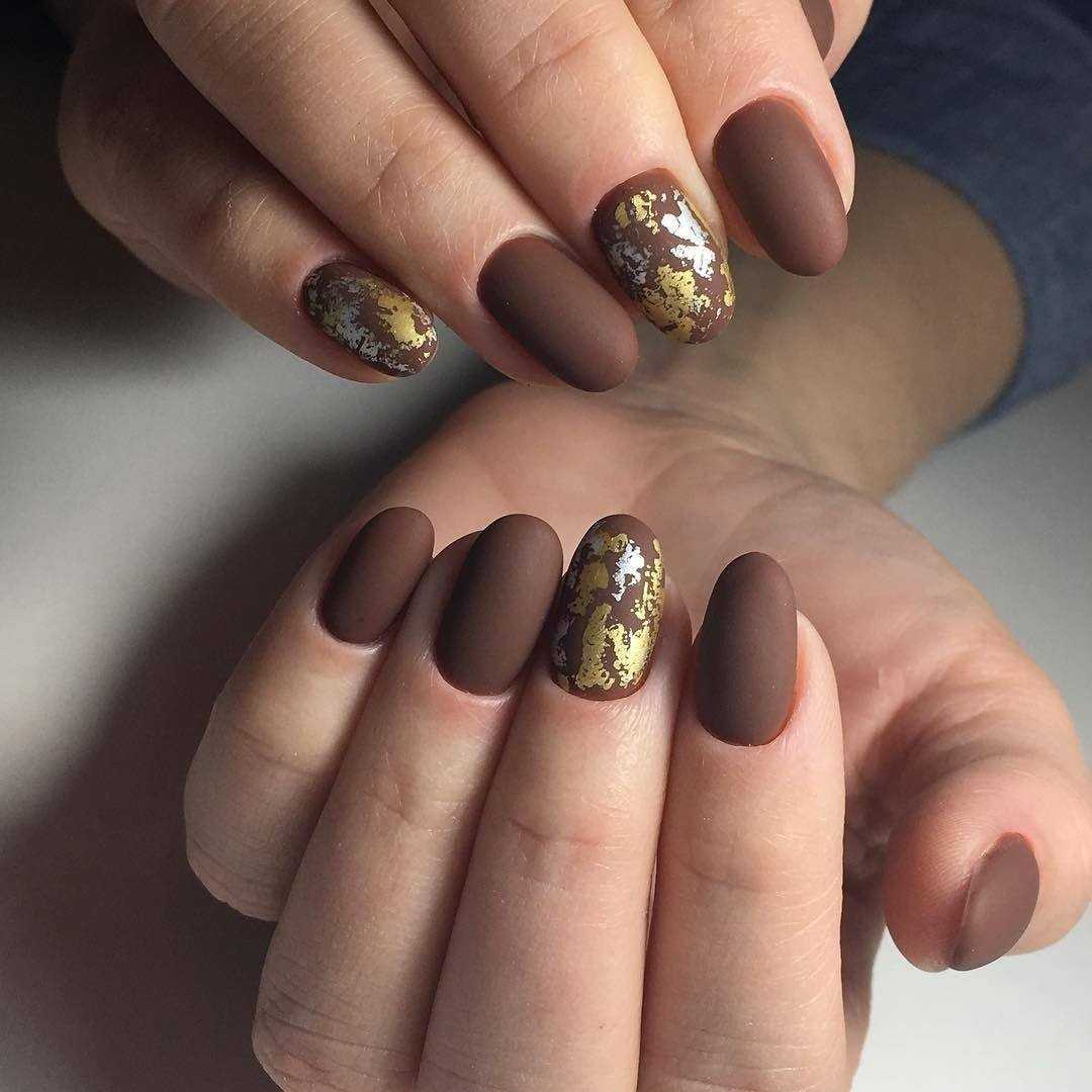 - маникюр с оттиском золотой фольгой на коричневом фоне – дизайн смотрится гораздо эффектнее, чем однотонное покрытие