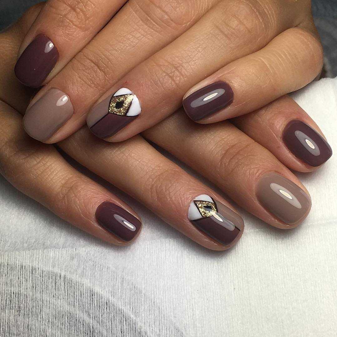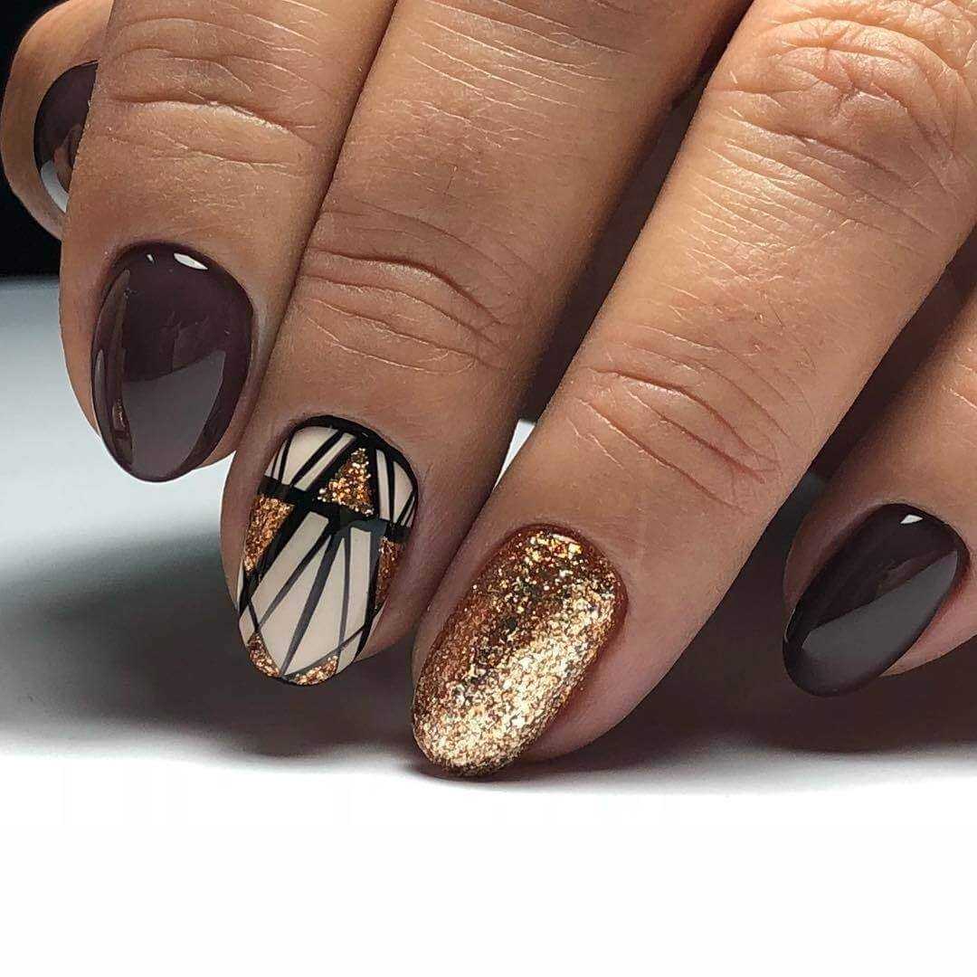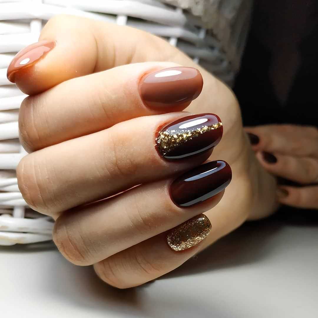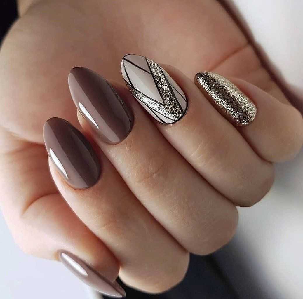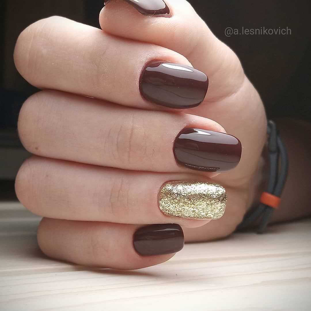 Однако при сочетании золотого цвета с коричневым можно получить шикарный дизайн ногтей, который будет отлично смотреться в деловом, повседневном и торжественном образе. Коричневый цвет смягчает броский золотой оттенок, такое сочетание облагораживает ноготки, делает образ девушек изящнее и женственнее.