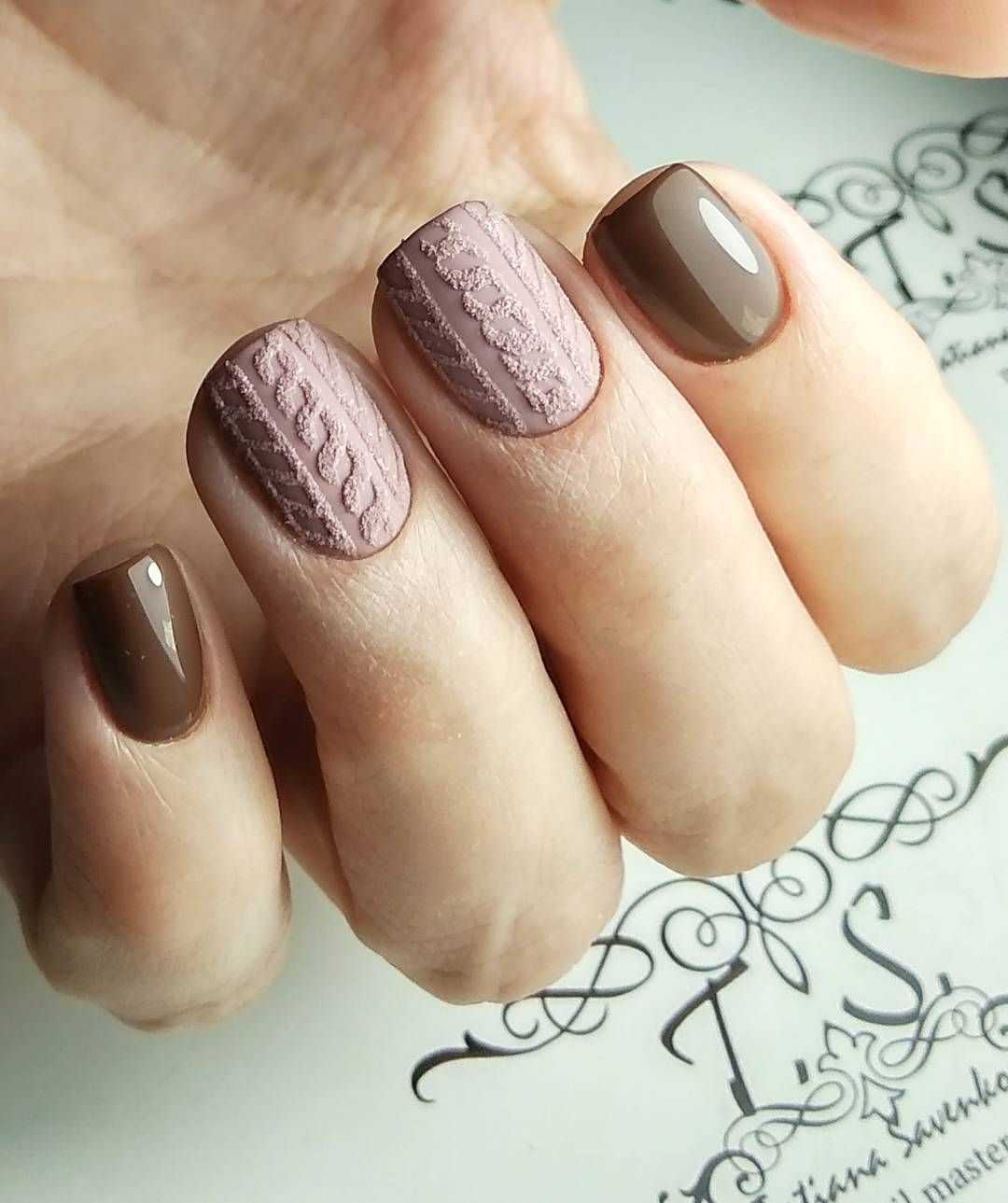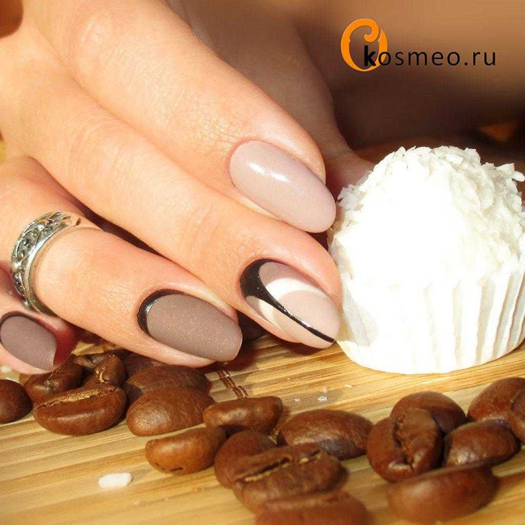 Еще одна тенденция подразумевает развитие “сладкой” кофейно-шоколадной темы в дизайне ногтей. На светло-коричневых ногтях рисуют кружечки с кофе, повторяют фактуру шоколада, изображают объемные зерна кофе и какао. Это все великолепие можно комбинировать с матовым пудровым дизайном или вязаным рисунком.