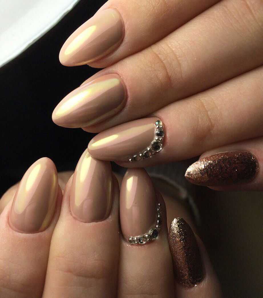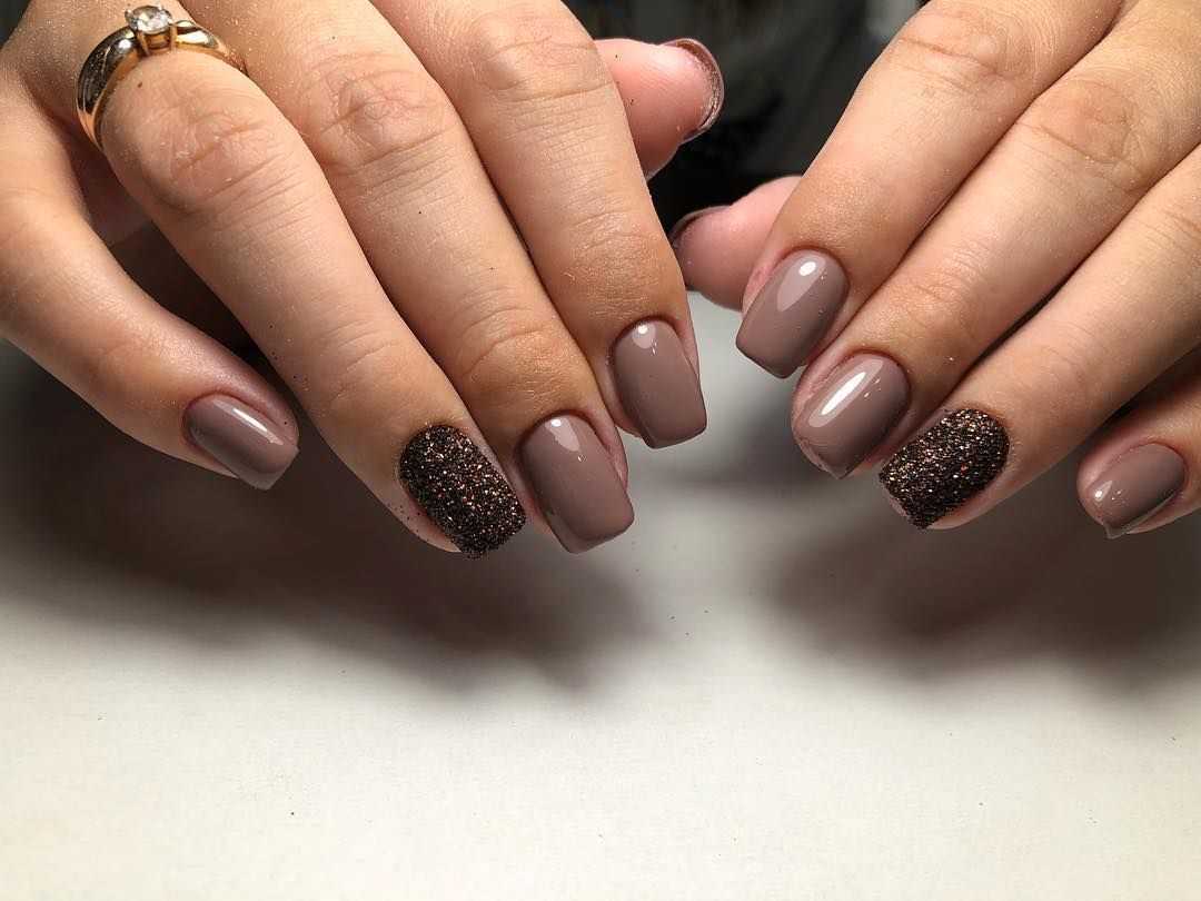 Тут, например, сочетается два оттенка – шоколадный и миндальный, а также плотные блестки.