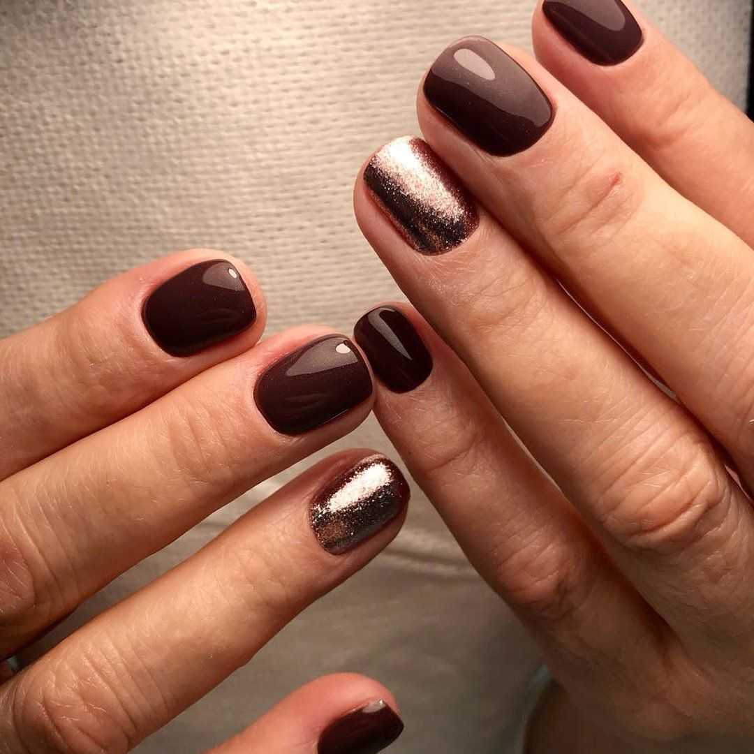 У большинства девушек короткие ногти и приходится выдумывать дизайн, который визуально сделает их чуть длиннее. Темные коричневые оттенки не очень подходят для коротких ногтей, но из положения можно выйти следующим образом: комбинировать коричневый с бежевым гель-лаком, не использовать крупный декор и множество рисунков, стараться сделать маникюр в стиле минимализм, чтобы не перегружать дизайн. Примеры оформления коротких ногтей с помощью коричневого гель-лака разных оттенков, смотрите в подборке фото.