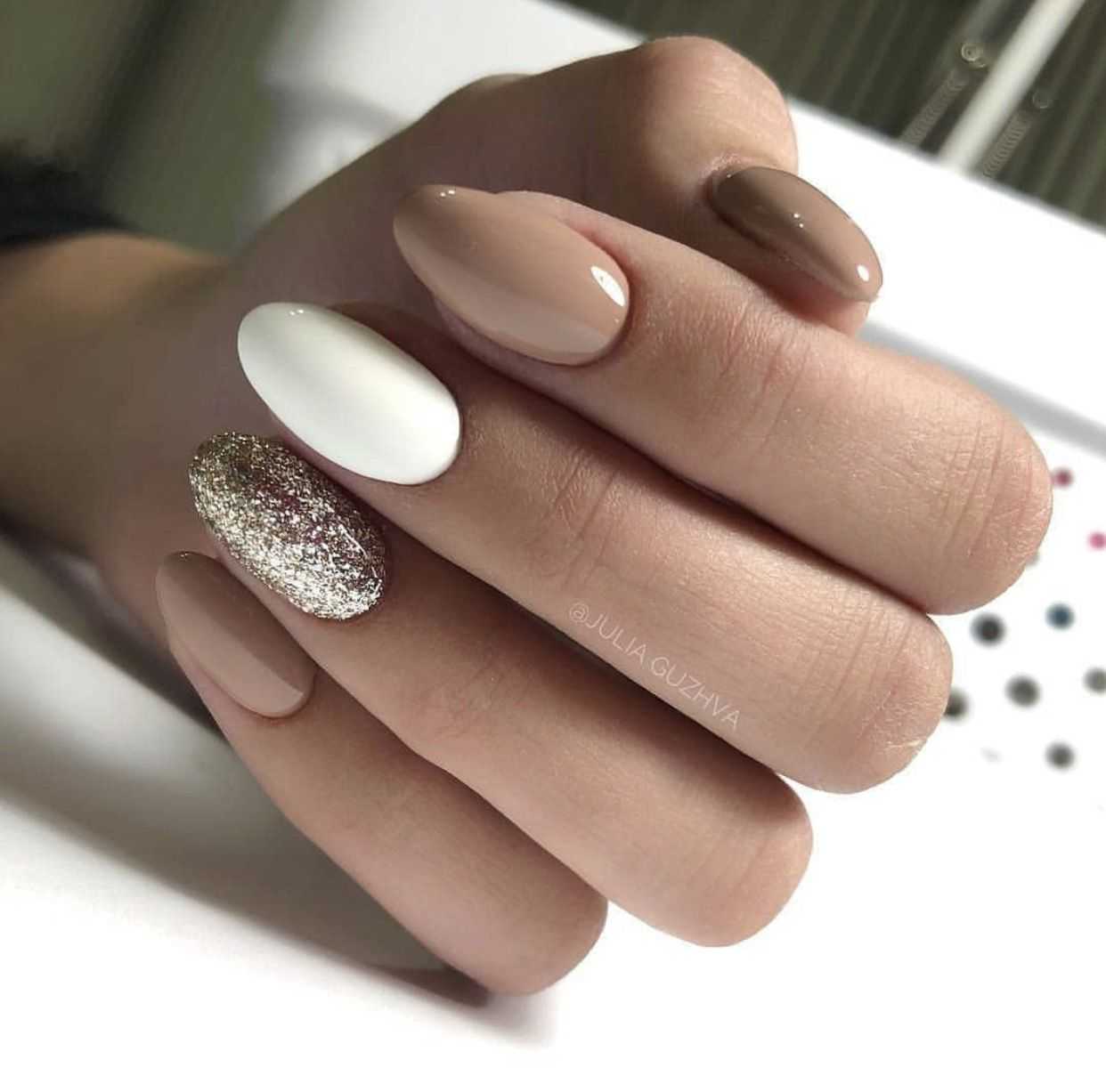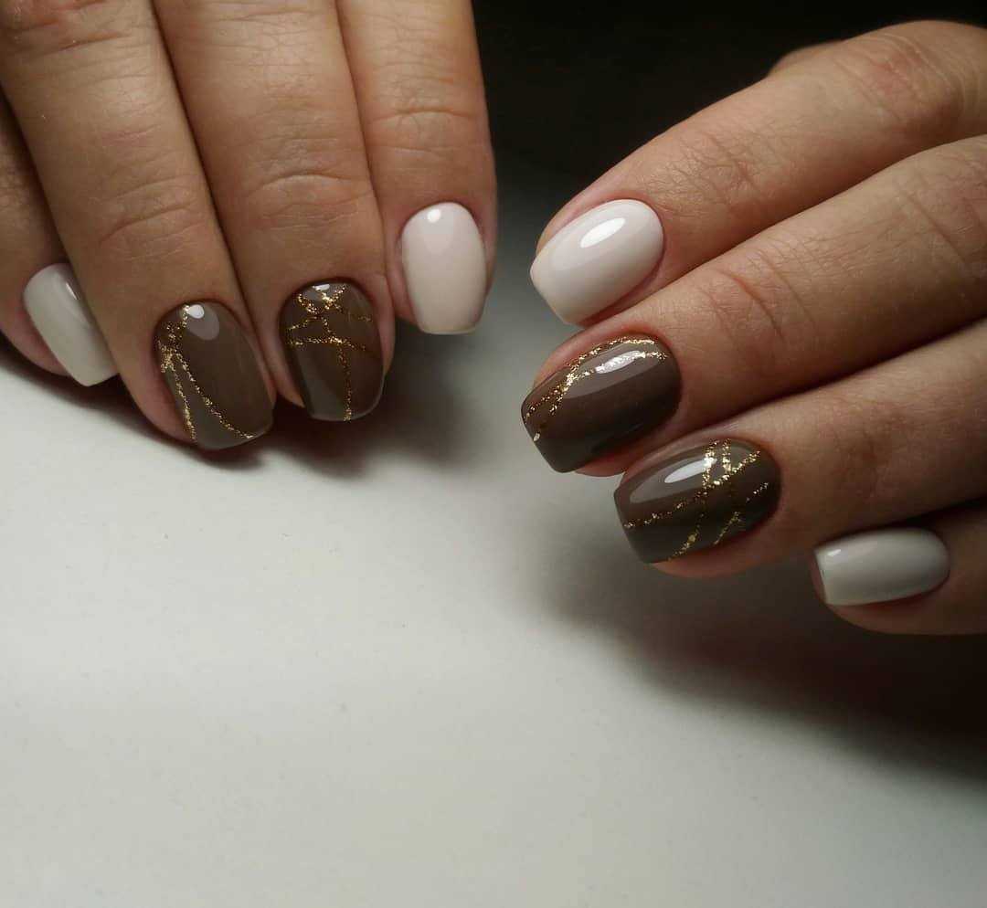 Чтобы маникюр в коричневом и золотом цвете смотрелся повседневнее добавьте в него белый оттенок. Выделите им 1-2 ноготка на руке, выполнив однотонное окрашивание.