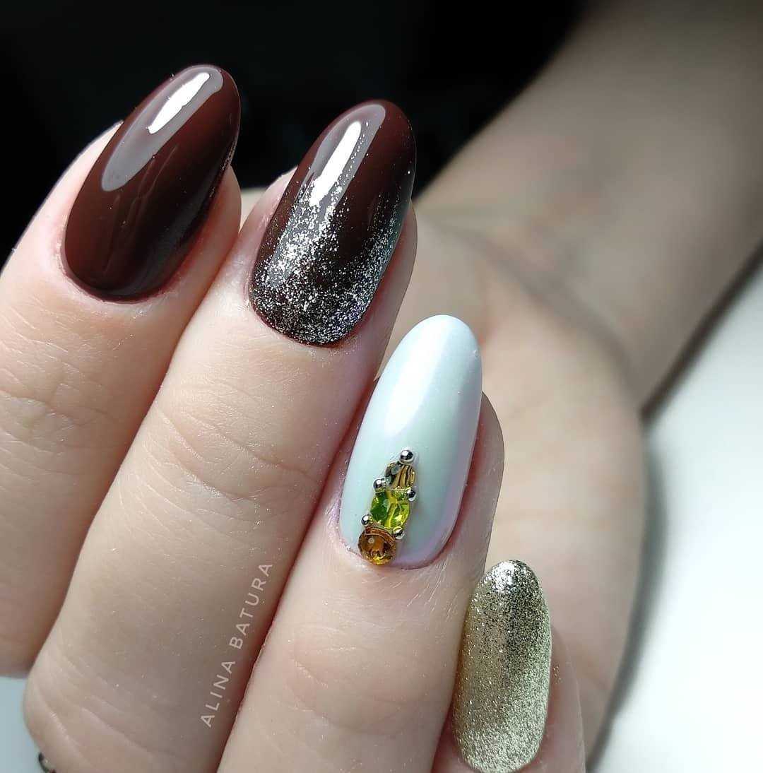 Третий тренд 2020 года – использование страз для инкрустации ногтей. Создать дизайн со стразами можно на основе гель-лака любого цвета. В коричневом маникюре лучше использовать технику золотого литья, золотые бульонки и микробисер. Подложку для страз лучше тоже выполнять из золота, так маникюр будет выглядеть более гармоничным.