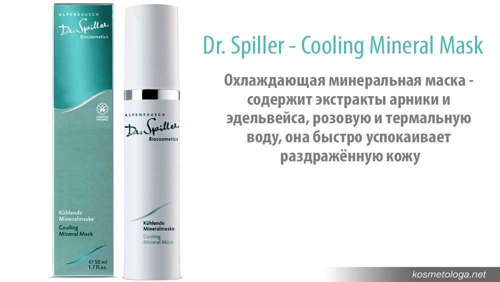 Я сама обладательница чувствительной кожи, поэтому часто пробую различные успокаивающие маски. В последнее время мне очень нравится охлаждающая минеральная маска Dr. Spiller — Cooling Mineral Mask. Эта маска содержит экстракты арники и эдельвейса, розовую и термальную воду, она быстро успокаивает раздражённую кожу — снимает покраснение, уменьшает отёчность, улучает внешний вид и цвет лица и обеспечивает эффект лифтинга.