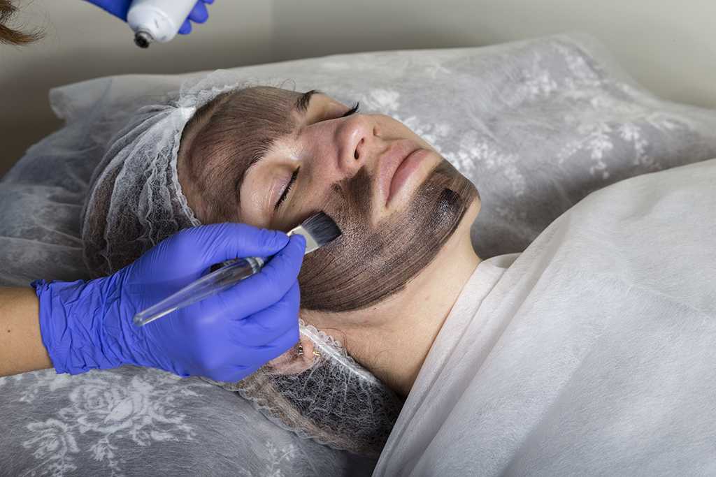 Такой пилинг проходит в два этапа. Сначала идет химическое, «углеродное» воздействие. Выгладит это как маска из активированного угля на лице. Кстати, благодаря этой части процедуру карбонового пилинга, бывает, называют «карбоновой чисткой лица».