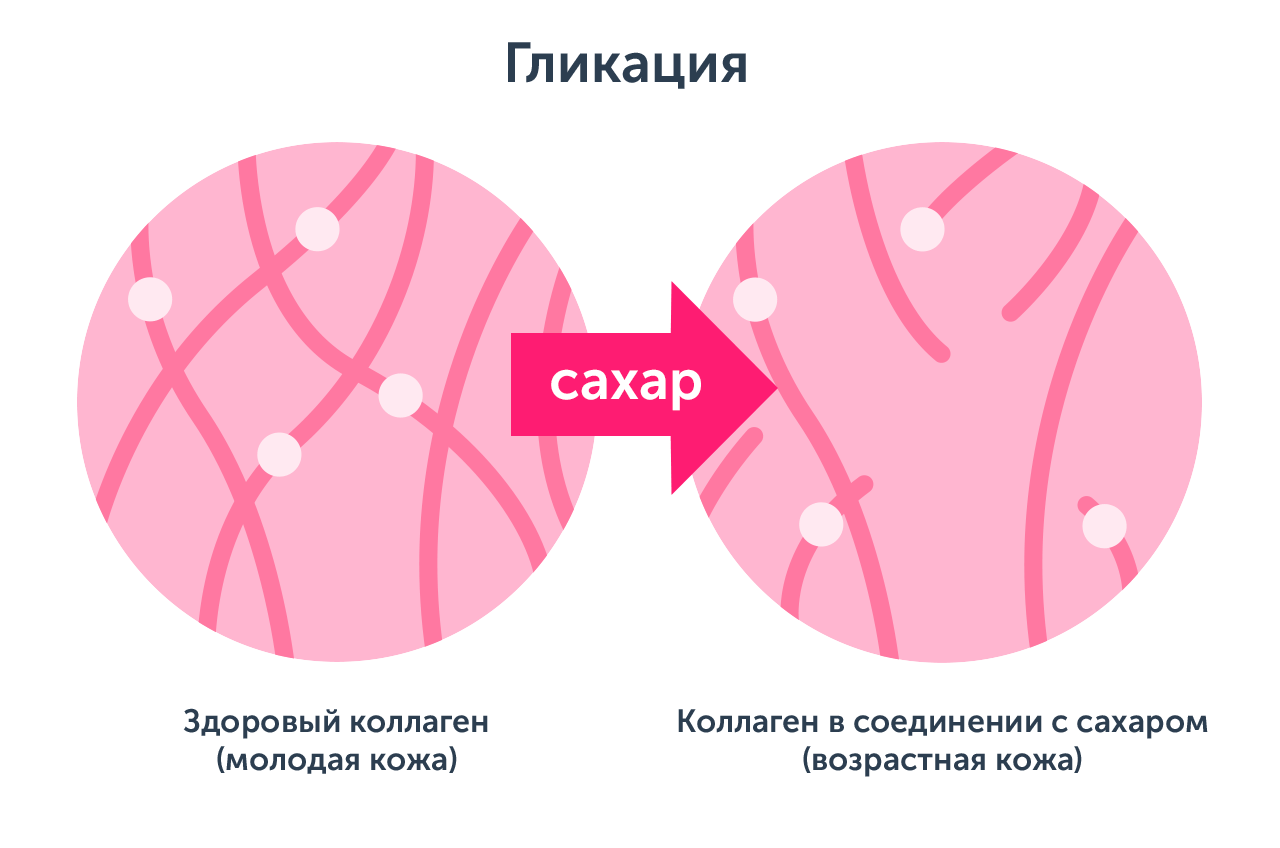 Зачем суп или овощи, когда есть бутерброды и пельмени, шоколадки и энергетики! А дальше никакой магии — сплошная биология: молекулы сахара буквально присасываются к молекулам коллагена. И в результат образуются те самые сшивки, о которых мы столько говорили.
